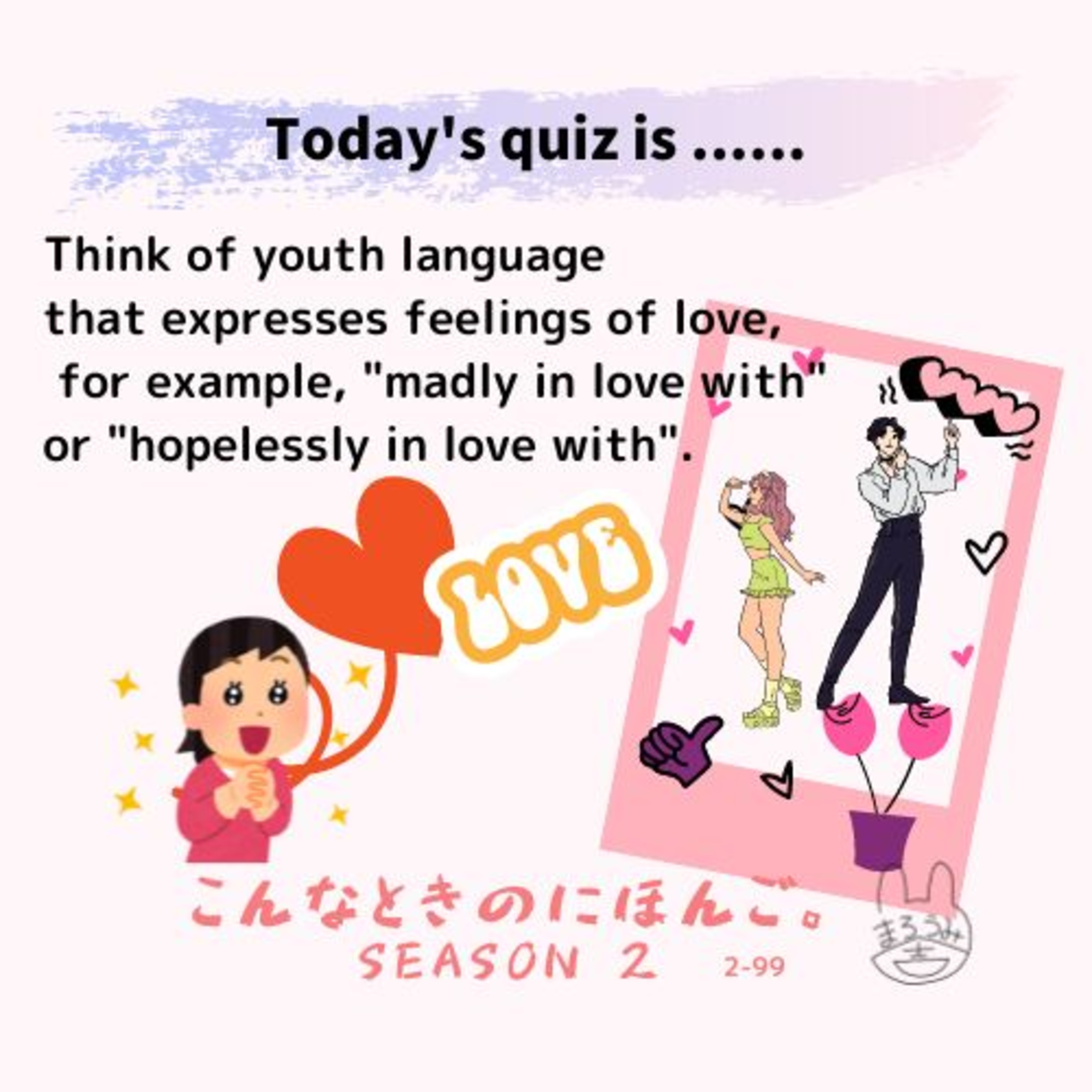 Think of youth language that expresses feelings of love, for example, "madly in love with" or "hopelessly in love with".