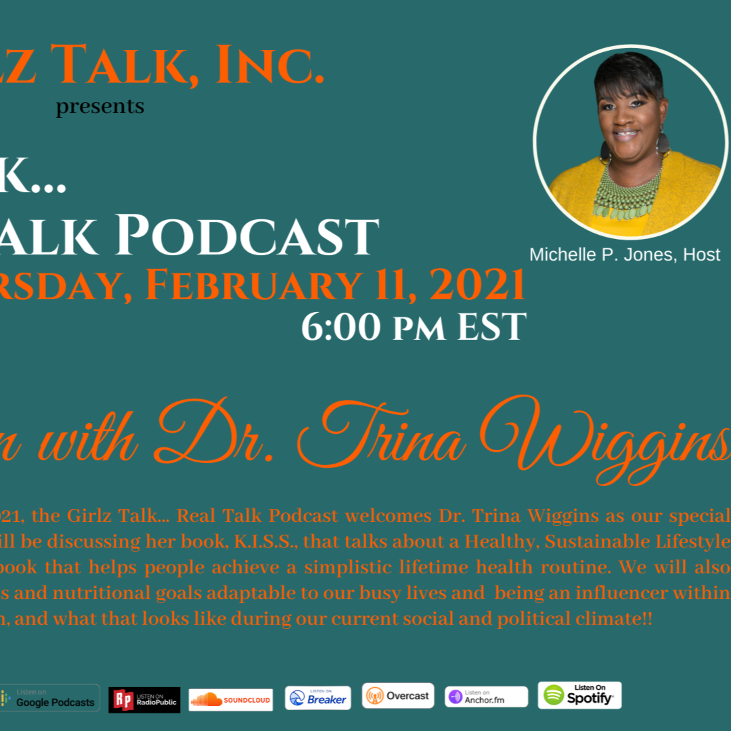 On Thursday, February 11, 2021, the Girlz Talk... Real Talk Podcast welcomes Dr. Trina Wiggins as our special guest. During this show we will be discussing her book, K.I.S.S., that talks about a Healthy, Sustainable Lifestyle and the accompanying workbook that helps people achieve a simplistic lifetime health routine. We will also converse about realistic fitness and nutritional goals adaptable to our busy lives and being an influencer within her community and profession, and what that looks like during our current social and political climate!!