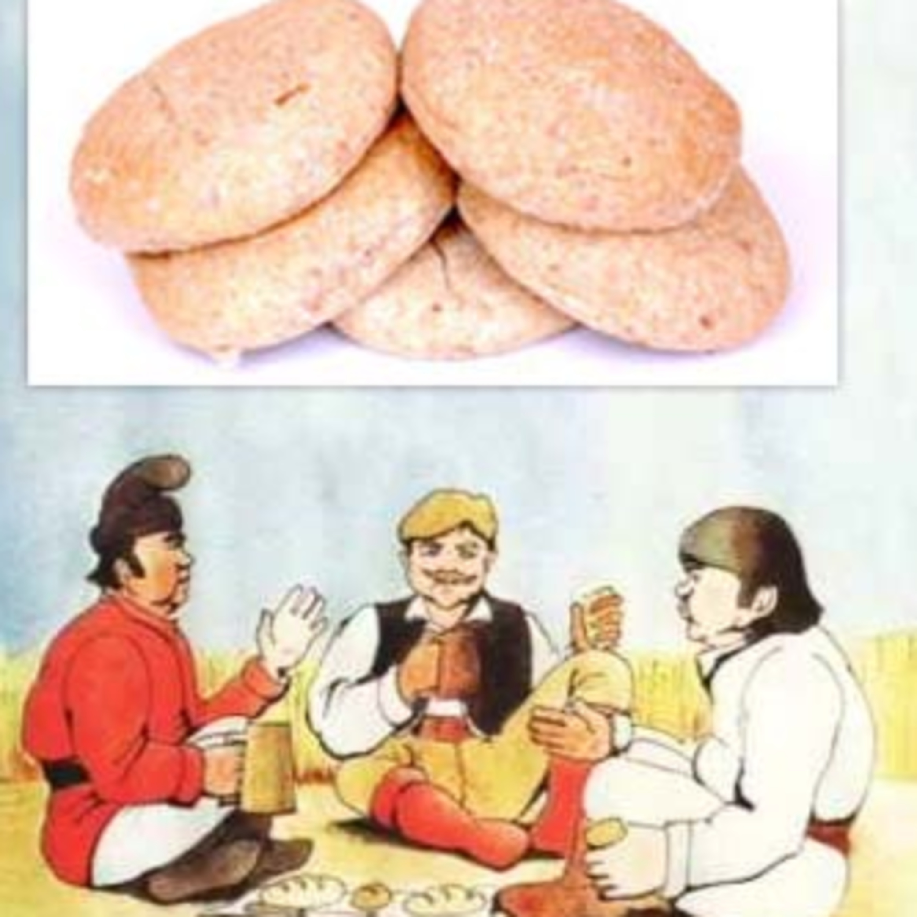 Cinci pâini sunt puse pe masă de doi drumeți pentru ei și un al treilea drumeț. Drumețul recunoscător oferă cinci lei pentru masa nesperată. De aici mai departe judecata poate fi împărțită, dar nu și mulțumirea celor care primesc banii.
