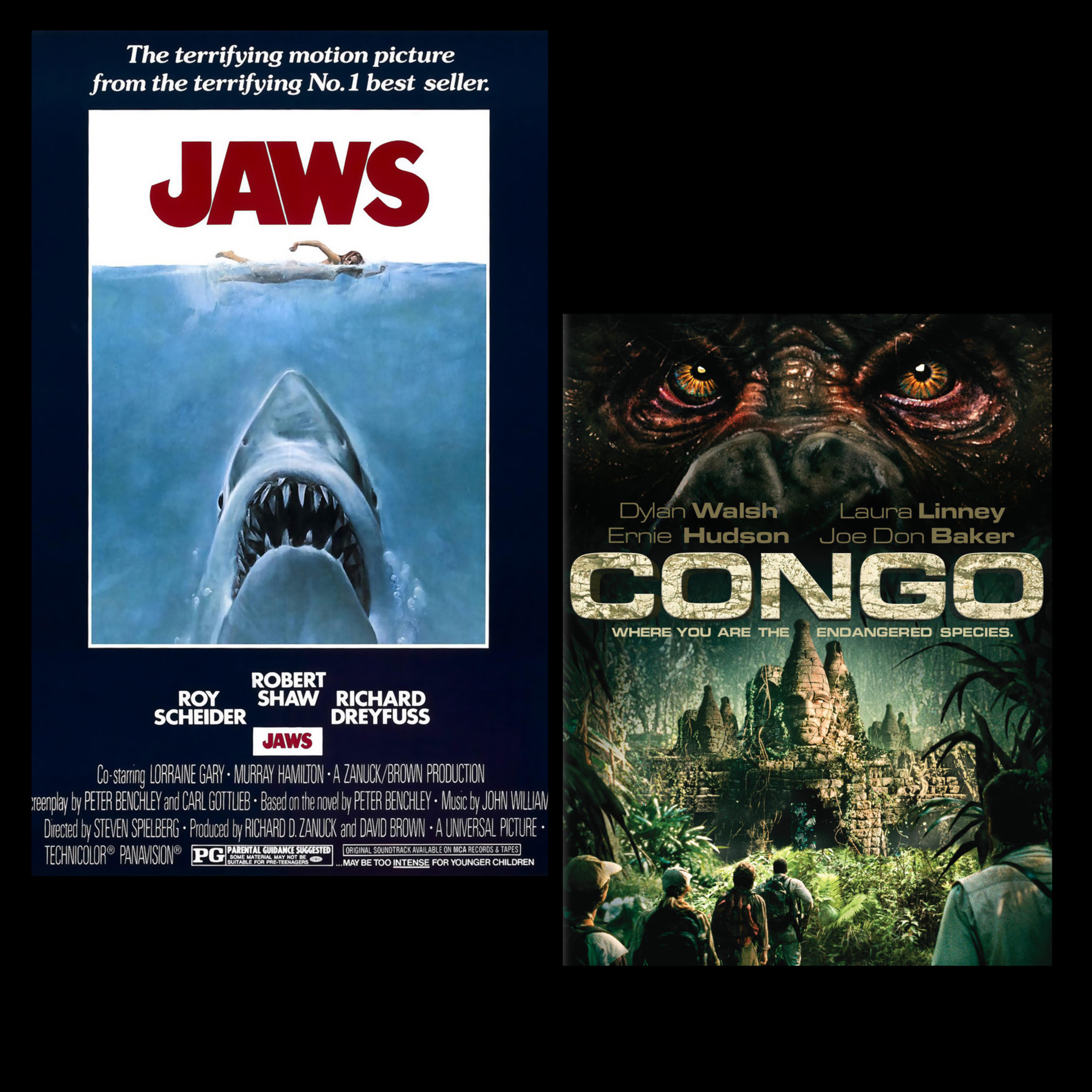 In this episode, we are taking a look at Thriller/Adventure "Jaws" from 1975 & Adventure/Action "Congo" from 1995.