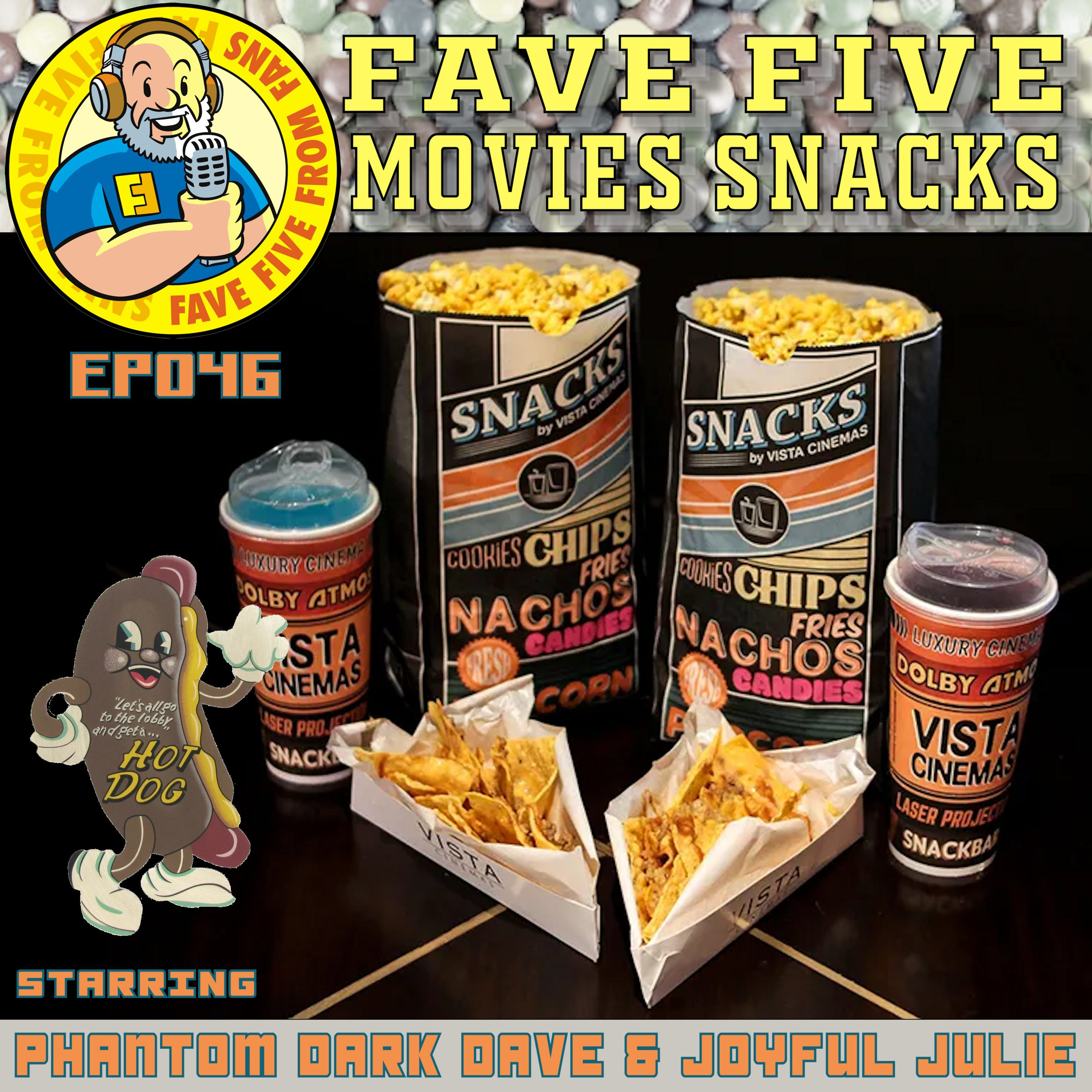 We love movies here on the Fave Five, AND we love snacks. So what better episode than our Fave Five Movie Snacks? And who better than Juvie (or is it Dalie), otherwise known as Joyful Julie and Phantom Dark Dave! We discuss what we like at home and at the movie theaters. And there’s a lot to cover. Pour some of that yellow stuff they call “butter” all over your Sno-Caps, and start picking the Ju-Ju beans for your teeth as we devour this episode of Fave Five From Fans. And leave us a question or comment about the show and we might feature it in a future episode. https://anchor.fm/fave-five-from-fans/message