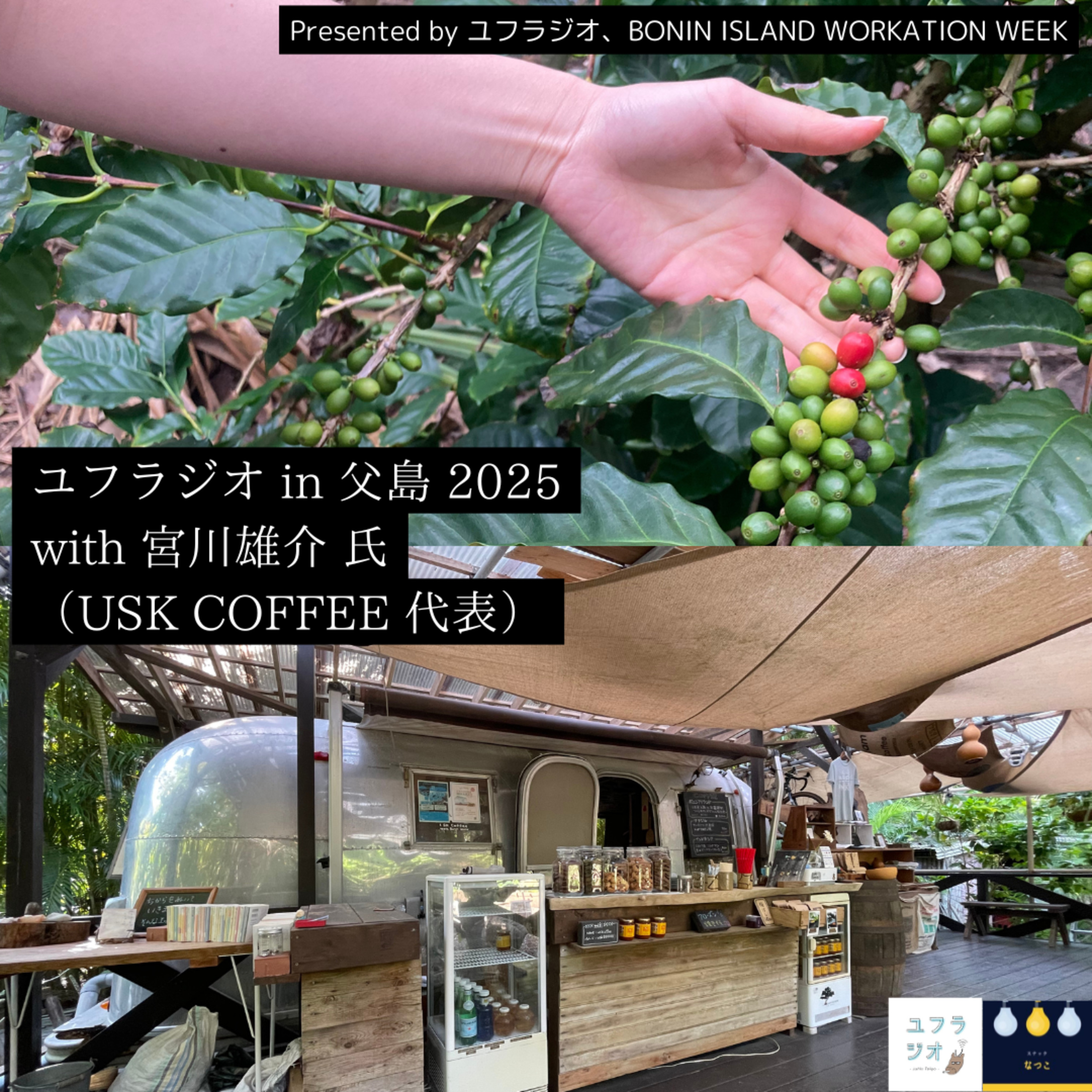 今回のエピソードは是非一度ゆっくりお話を聞いて見たかった、父島唯一、そして日本国内でも片手で数えるくらいしかないコーヒー農園併設カフェUSKコーヒーの代表、宮川雄介さんをお迎えして、鶏が鳴きまくるuskコーヒーの店内にて収録しております。