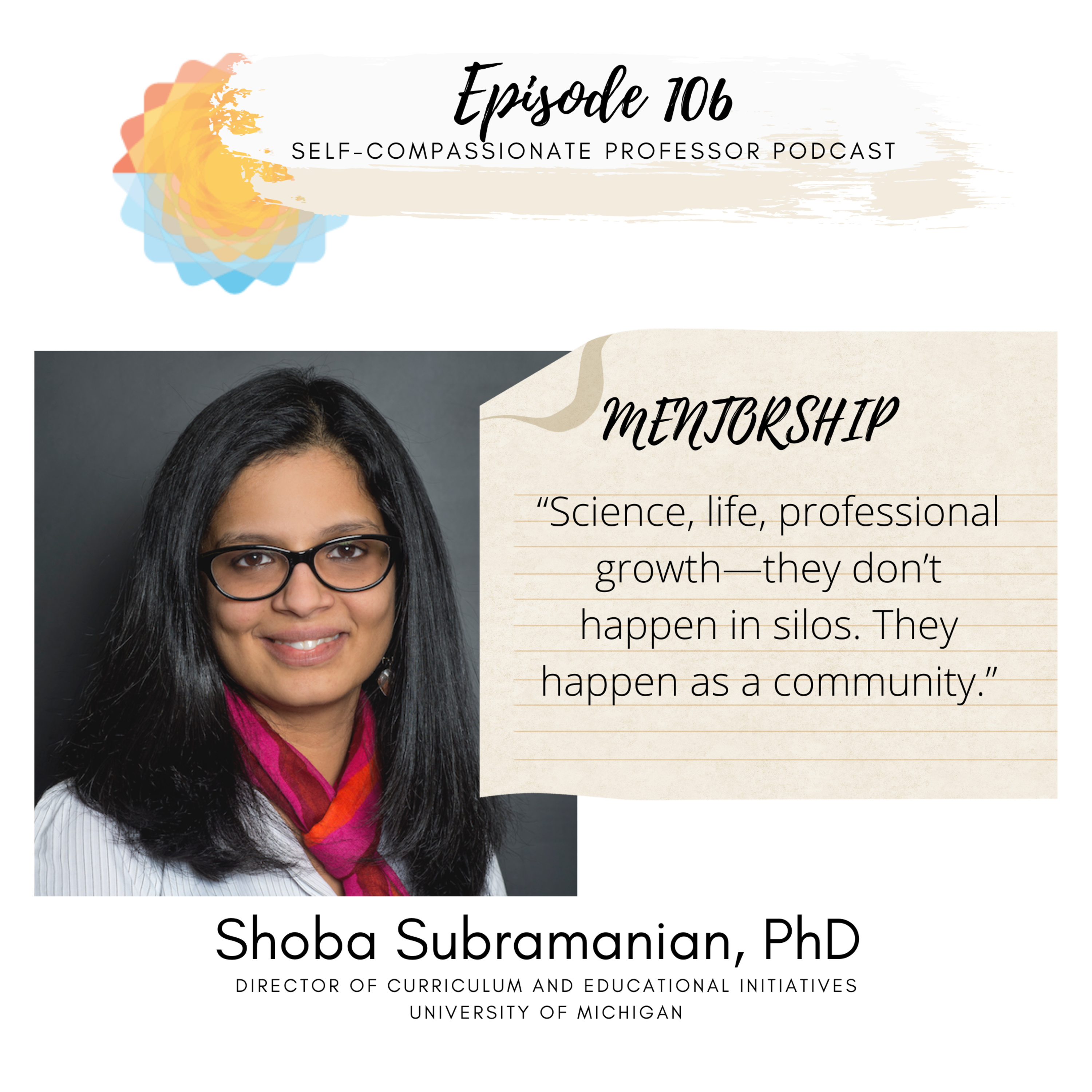 Dr. Shoba Subramanian demonstrates the power of mentorship on individuals, institutions, and society, arguing for environments where kindness, empathy, trust, and sharing are embraced, a “personal board of mentors” philosophy is normalized, great focus is placed on the professional growth of mentees, and space is made for a natural cycle of mentees eventually becoming mentors themselves. It is in these environments, as Shoba explains, where professional growth, positive institutional change, and wellness thrive.