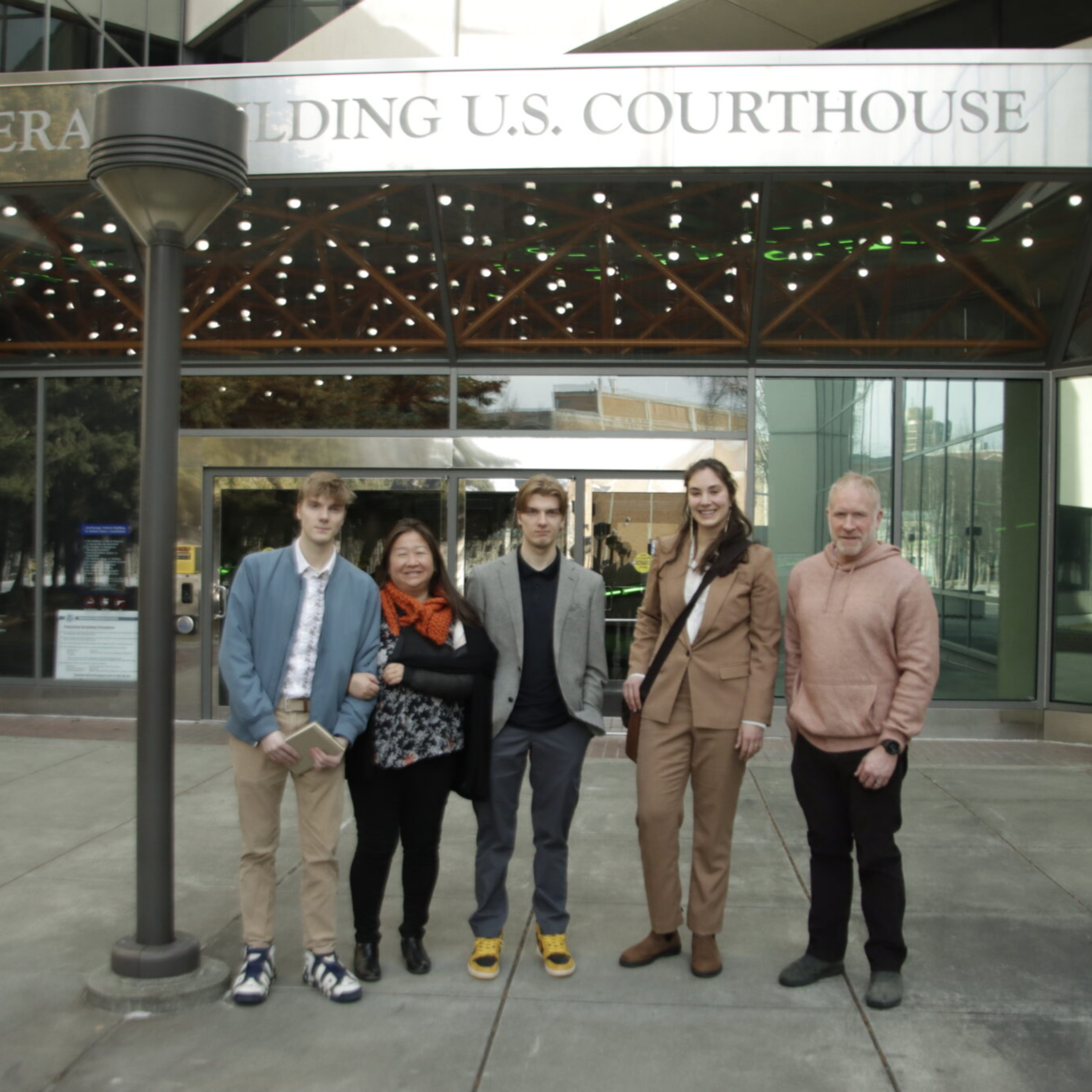 Photo: Plaintiffs who sued the Mat-Su School District over the removal of 56 books without review (from left to right) Mitchell Clarkson, Dawn Adams, Gannon Clarkson, Northern Justice Project attorney Savannah Fletcher and Scott Adams on April 2, 2024 (Tim Rockey / Alaska Public Media)