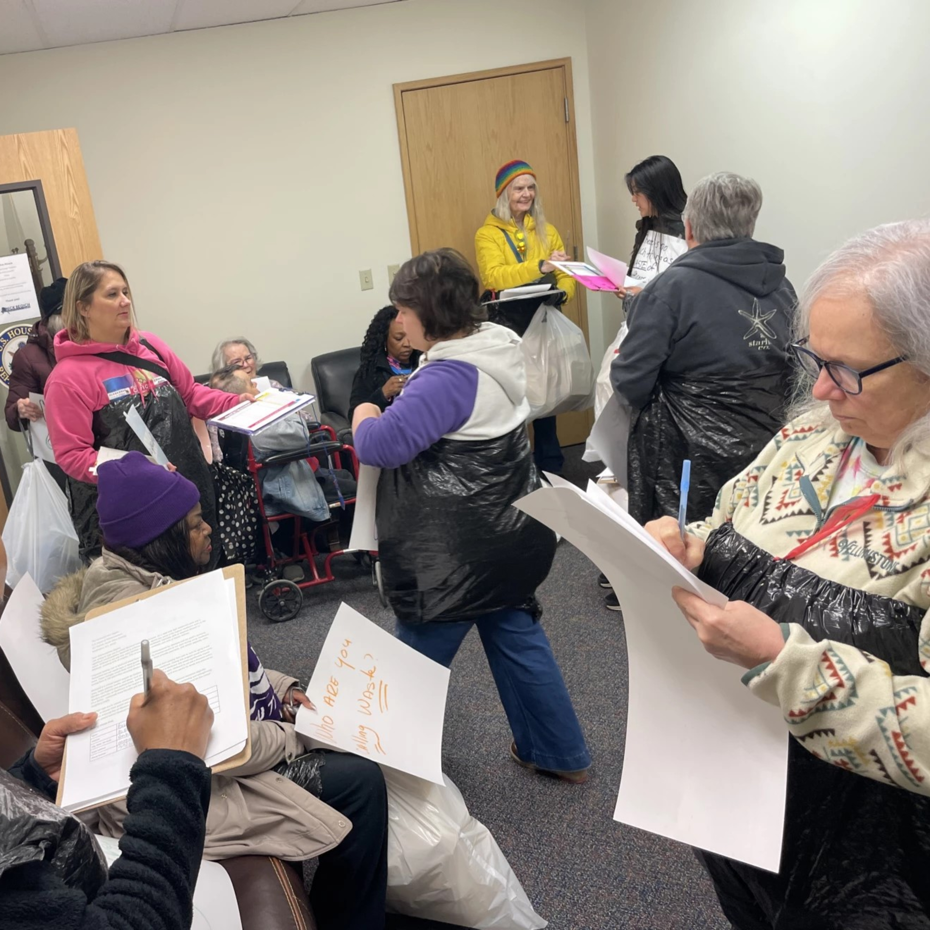 Photo: Caregivers and other supporters of Medicaid gather on April 21, 2025 in the lobby of Congressman Nick Begich's Anchorage office. (Liz Ruskin/Alaska Public Media)
