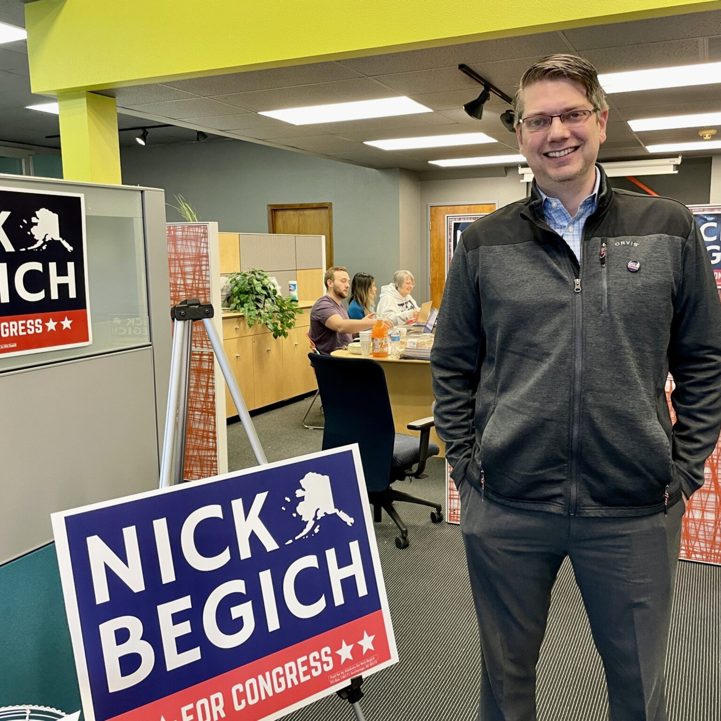 Photo: Nick Begich III at his Anchorage campaign headquarters during the 2022 campaign. (Liz Ruskin/Alaska Public Media)