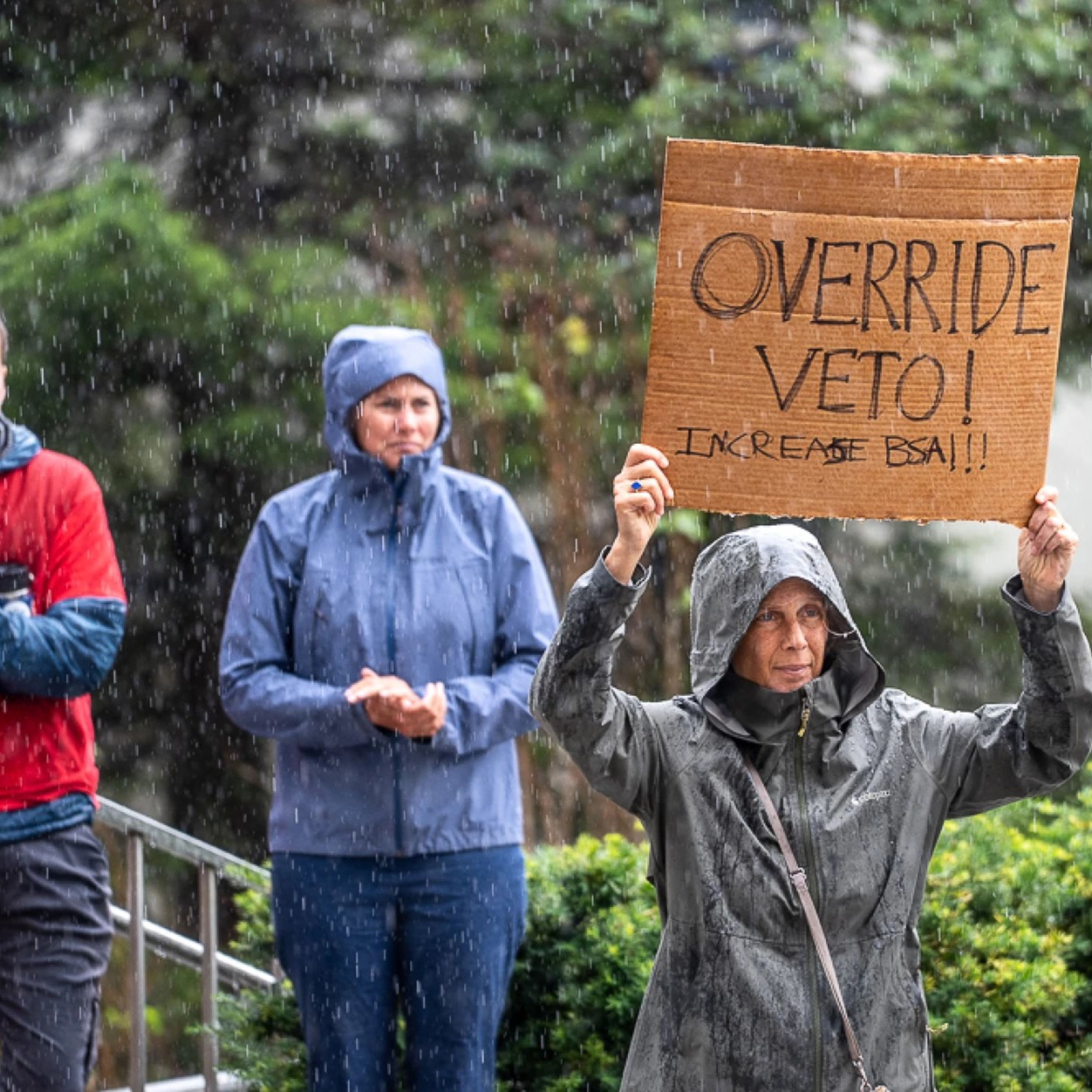 Photo: Suzanne Cohen holds a sign in the rain outside the Alaska State Capitol on Friday, Aug. 1 calling on lawmakers to override Gov. Mike Dunleavy's veto of more than $50 million in public school funding. (Eric Stone/Alaska Public Media)