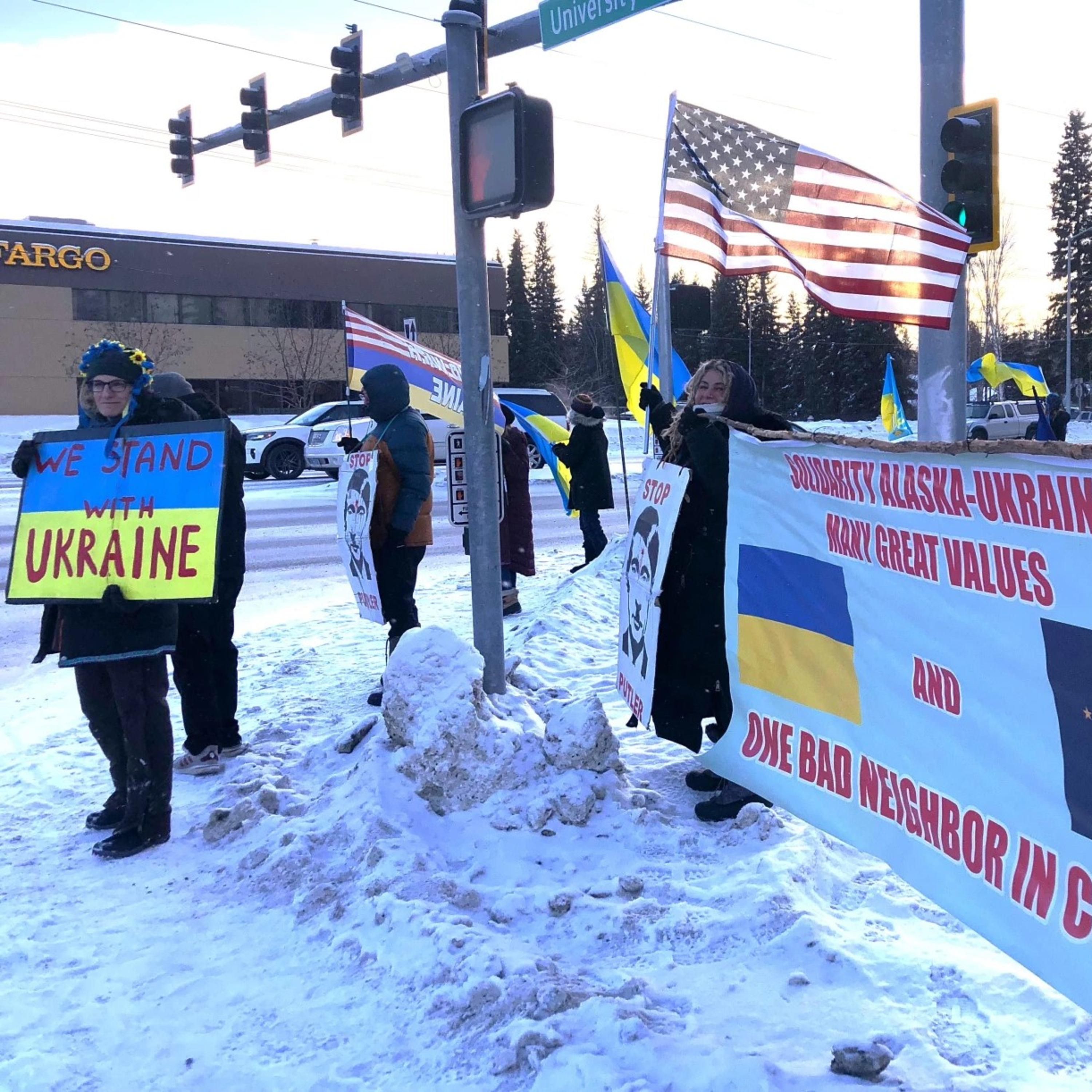 Photo: Protesters mark the third anniversary of the Russian invasion of Ukraine at the corner of Geist Road and University Avenue on Monday, Feb. 24, 2025. (Robyne/KUAC)