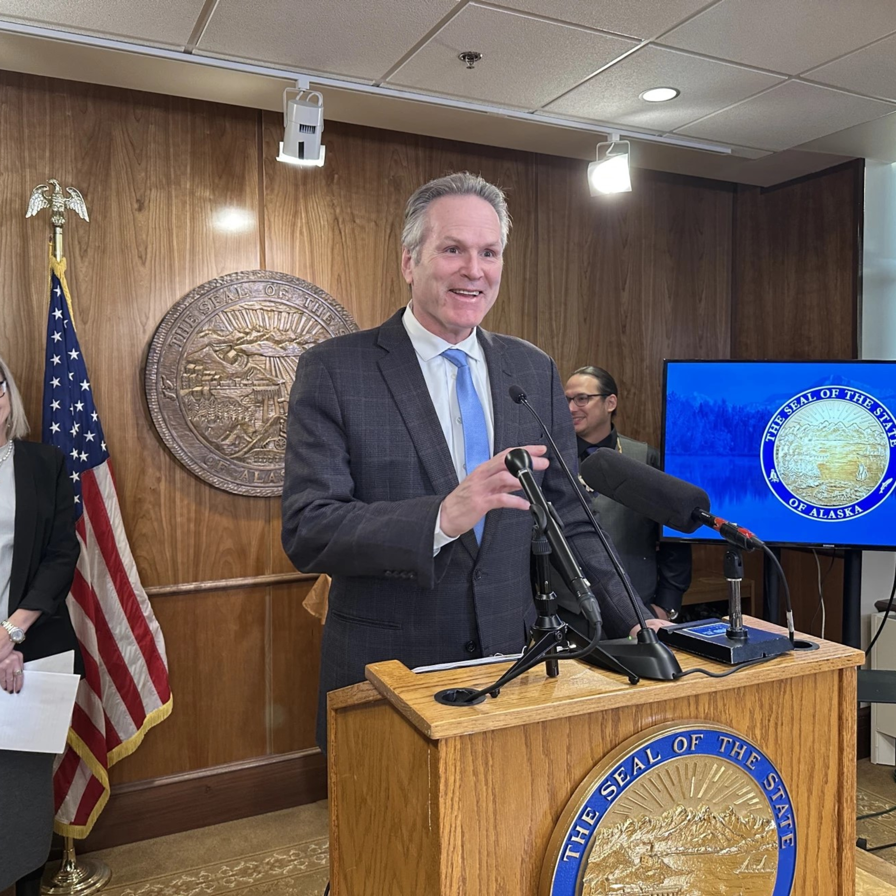 Photo: Gov. Mike Dunleavy speaks to reporters in the Cabinet Room in the Alaska State Capitol on Friday, Jan. 31, 2025. (Eric Stone/Alaska Public Media)