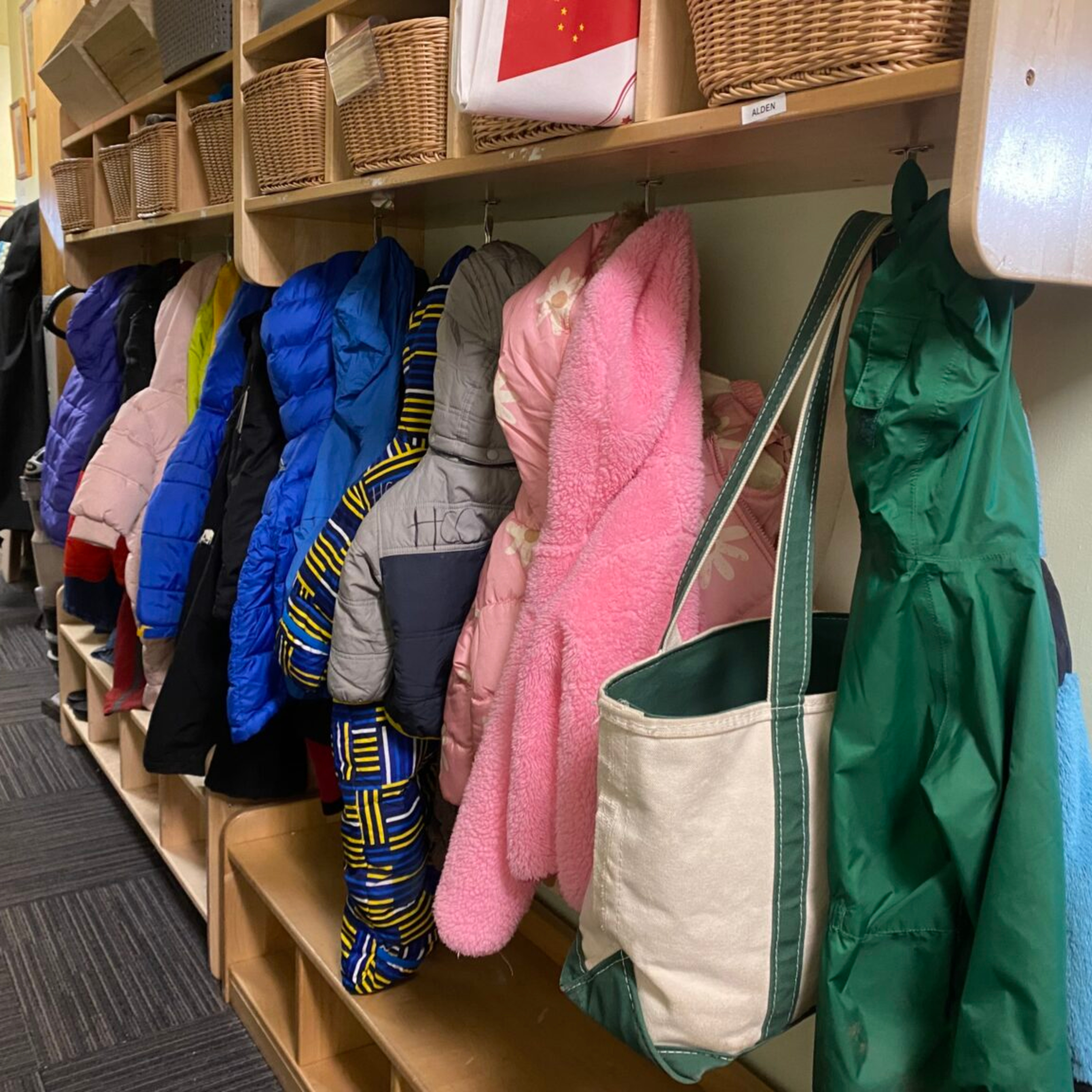Children's coats hang in a hallway at Hillcrest Childcare Center in Anchorage o n April 18. The second and final report of a child care task force holds recommendations for expanding subsidies that families receive, speeding the caregiver licensing and hiring process and other steps intended to address the state's shortage of affordable child care. (Photo by Claire Stremple/Alaska Beacon)