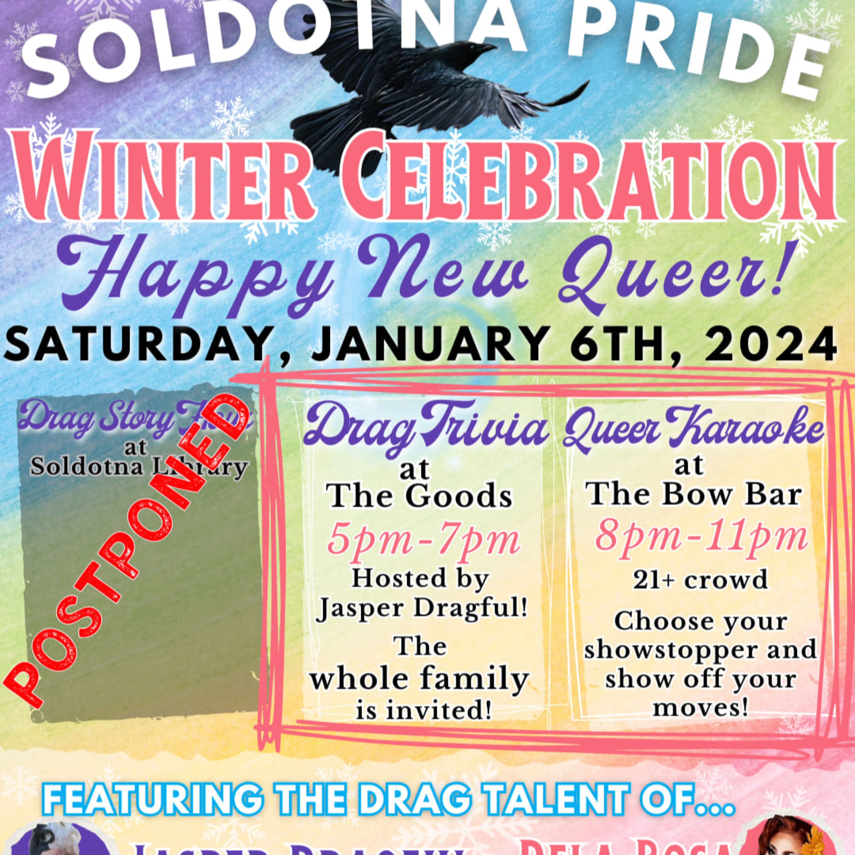 Photo: Online poster announcing the postponement of a drag show to be held at the Soldotna Library.
