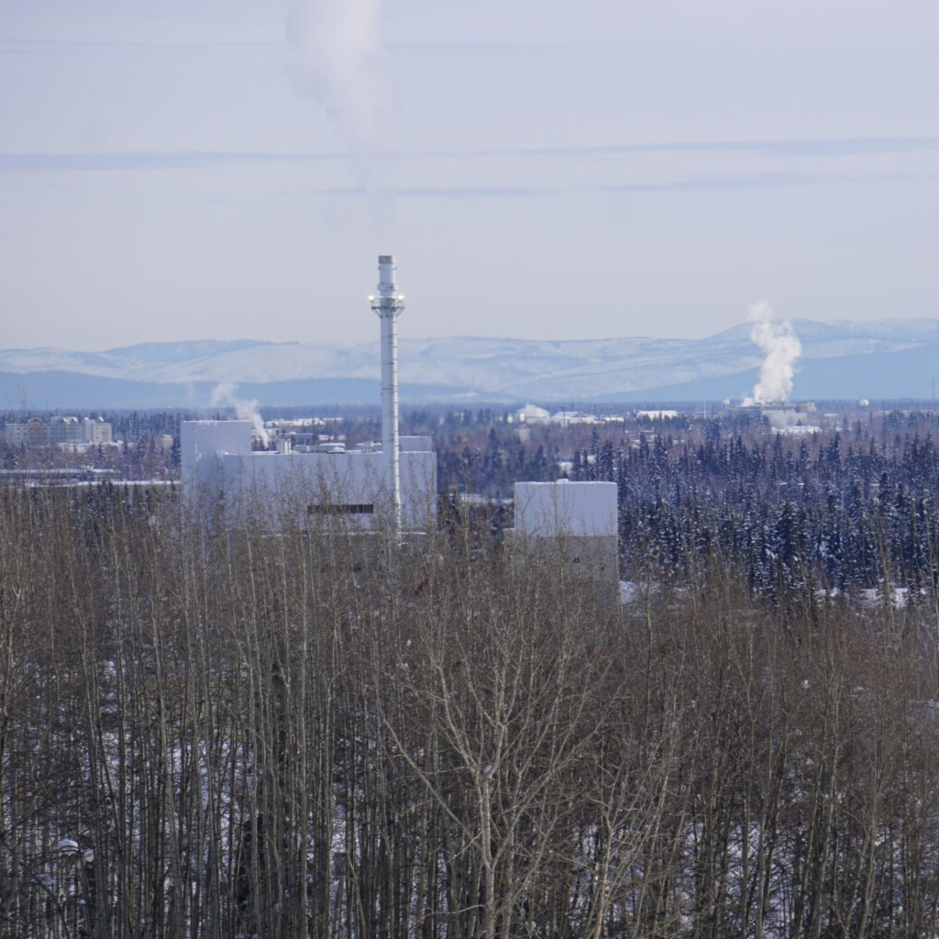 Photo: Smokestack emissions are seen along the Fairbanks skyline on March 1, 2023. At left is the coal-fired heat and power plant on the University of Alaska Fairbanks campus. (Photo by Yereth Rosen/Alaska Beacon)