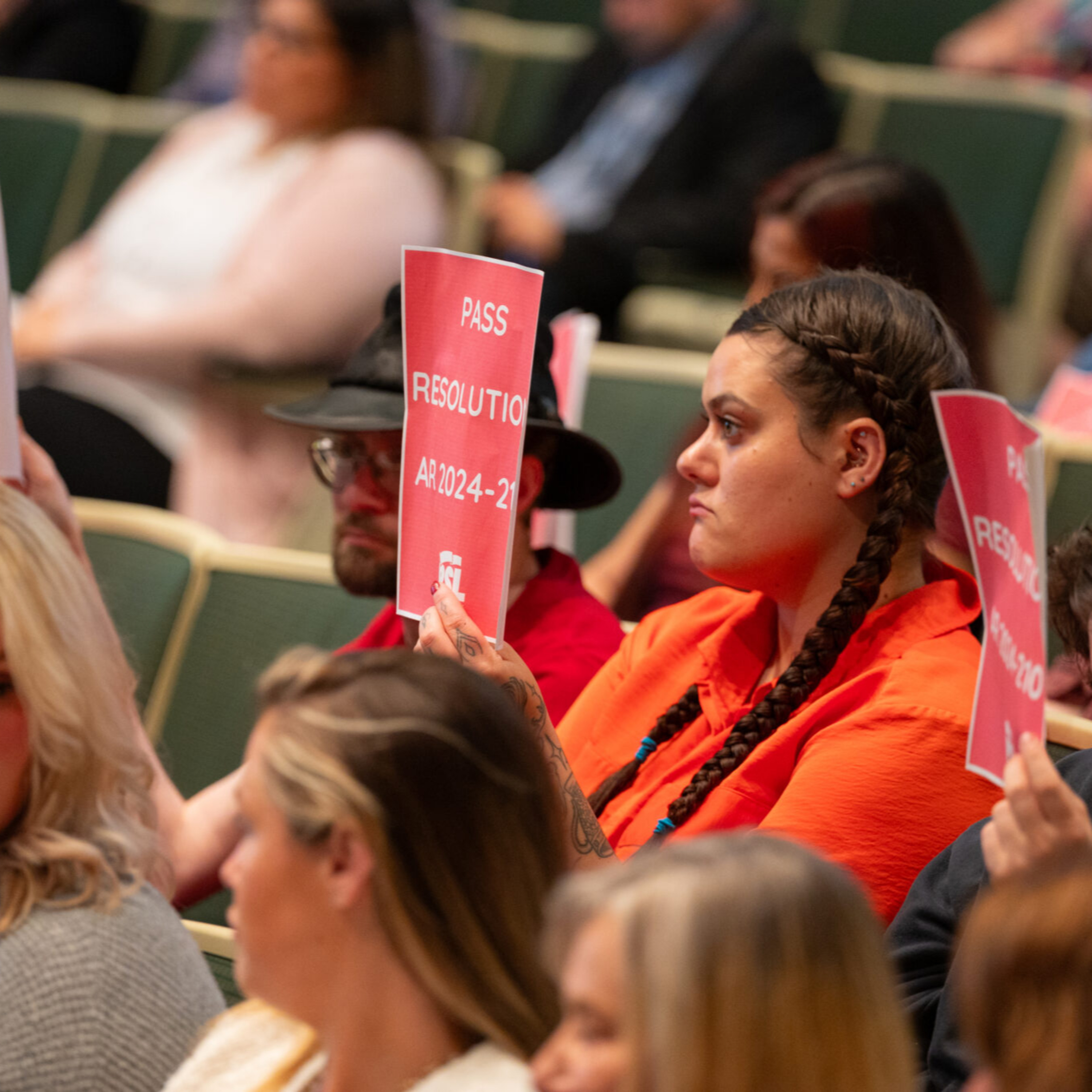 Photo: Protestors in the audience of the Anchorage Assembly meeting on July 16, 2024 at the Loussac Library hold up branded signs of the Party for Socialism and Liberation. The signs support a resolution urging the police department to make its body camera policies more transparent. (Matt Faubion/Alaska Public Media)