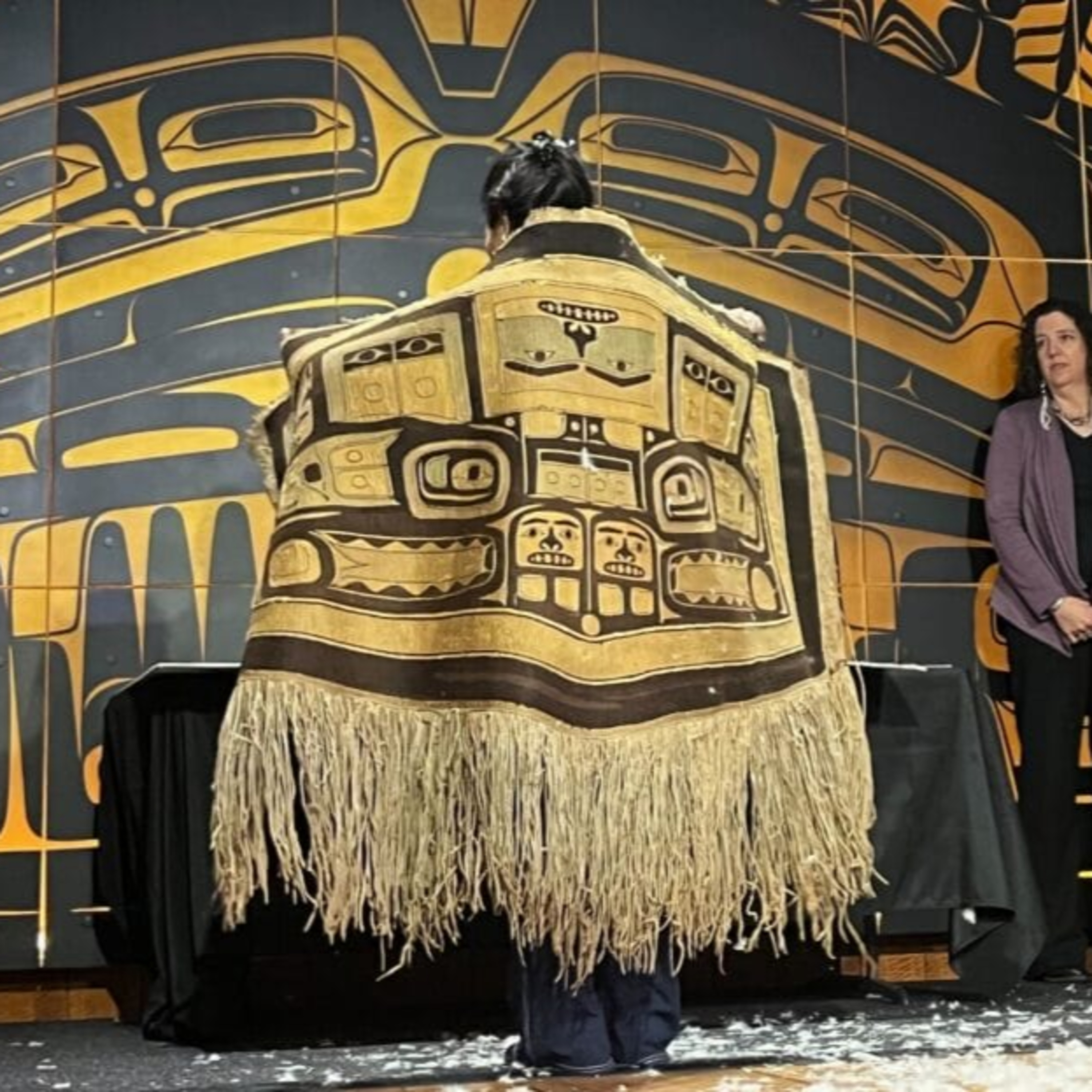 Photo: Sainteen Anna Brown Ehlers wears a 150-year-old Chilkat robe that was recently returned to Southeast Alaska on March 1, 2024.