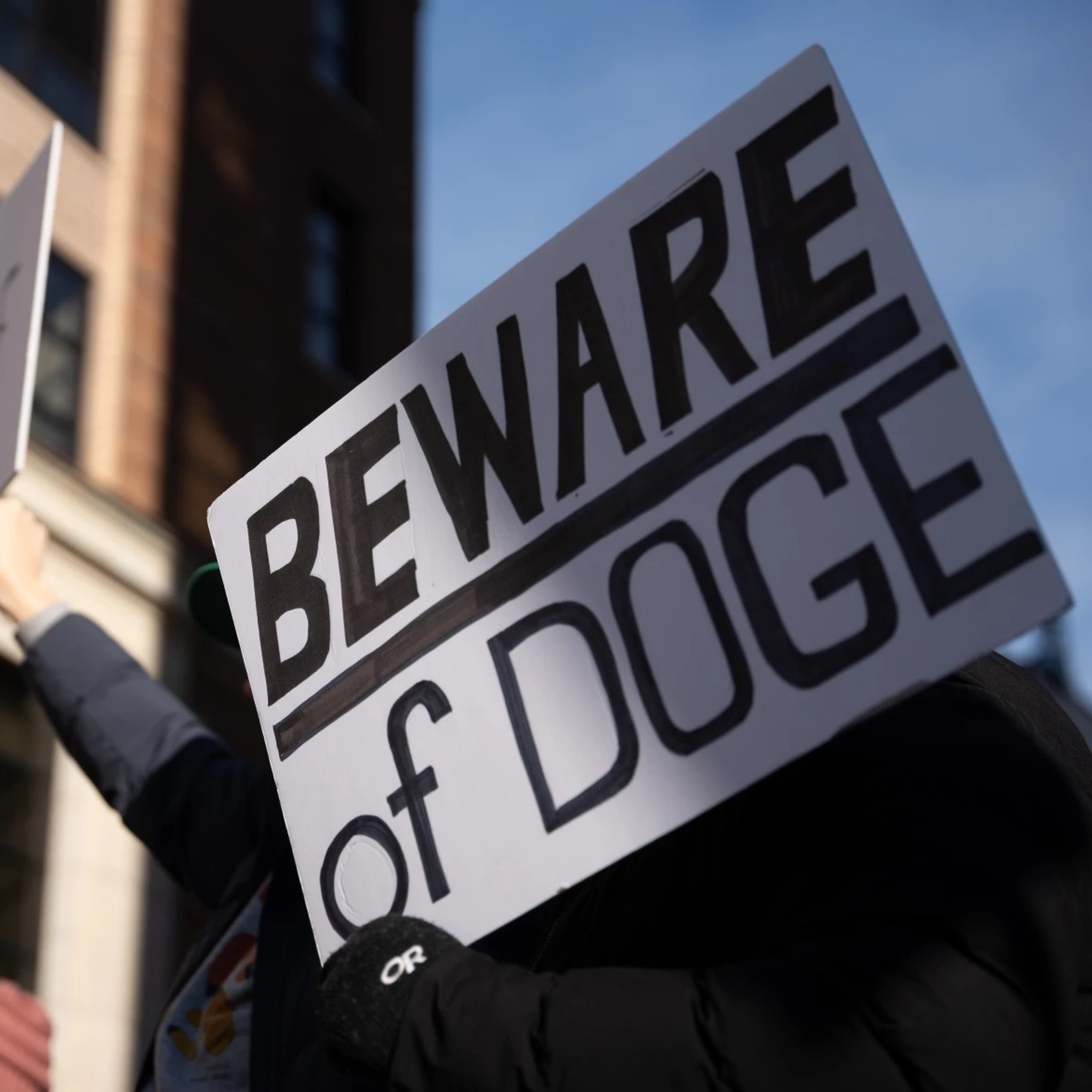 Photo: Demonstrators gather outside the Alaska State Capitol in Juneau to protest the Trump administration's policies on Feb. 17, 2025. (Eric Stone/Alaska Public Media)
