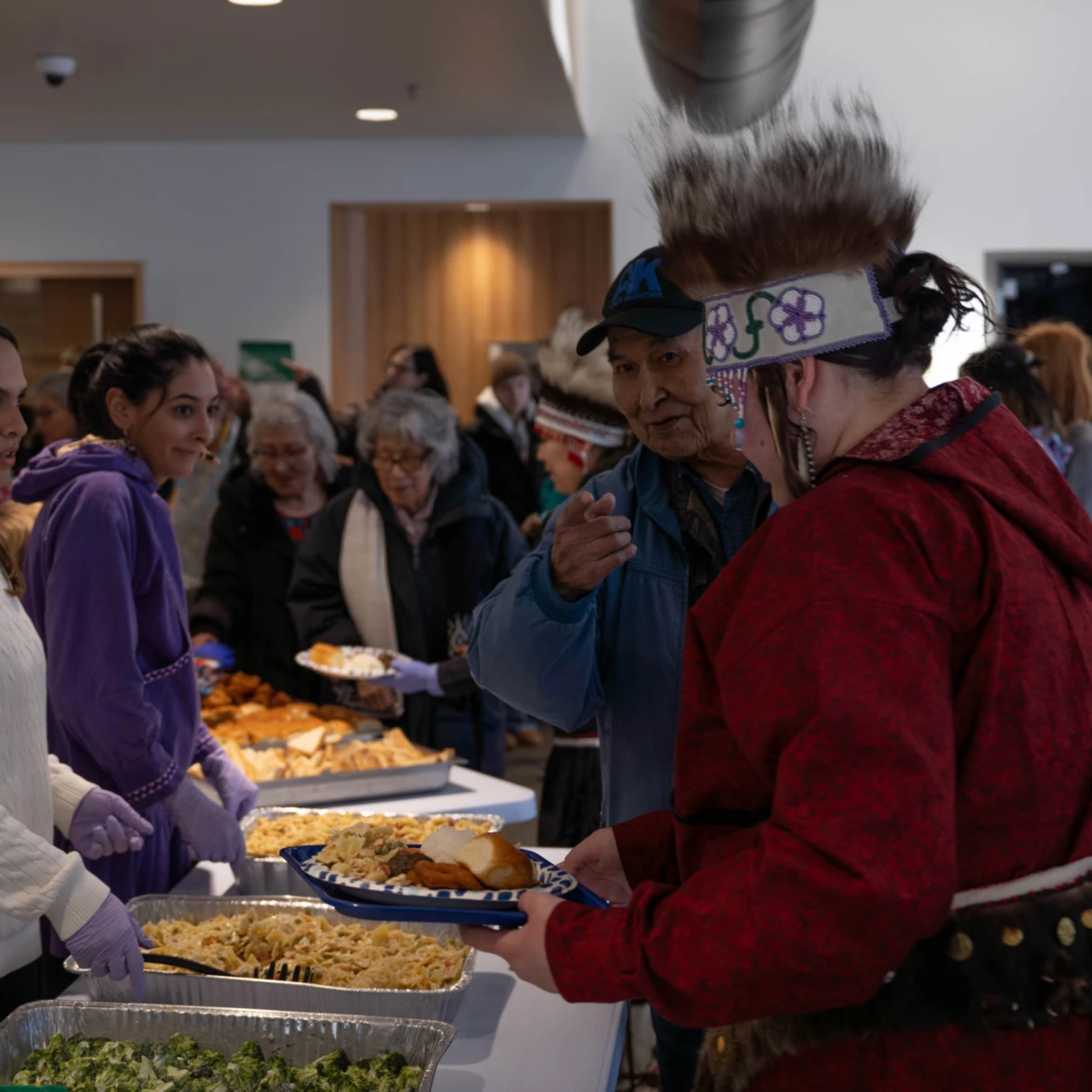 Photo: Tatiana Taanka Korthuis, later crowned 2024’s Miss Cama-i, serves Elders at the Native Foods Dinner at Bethel Regional High School on March 16, 2024.