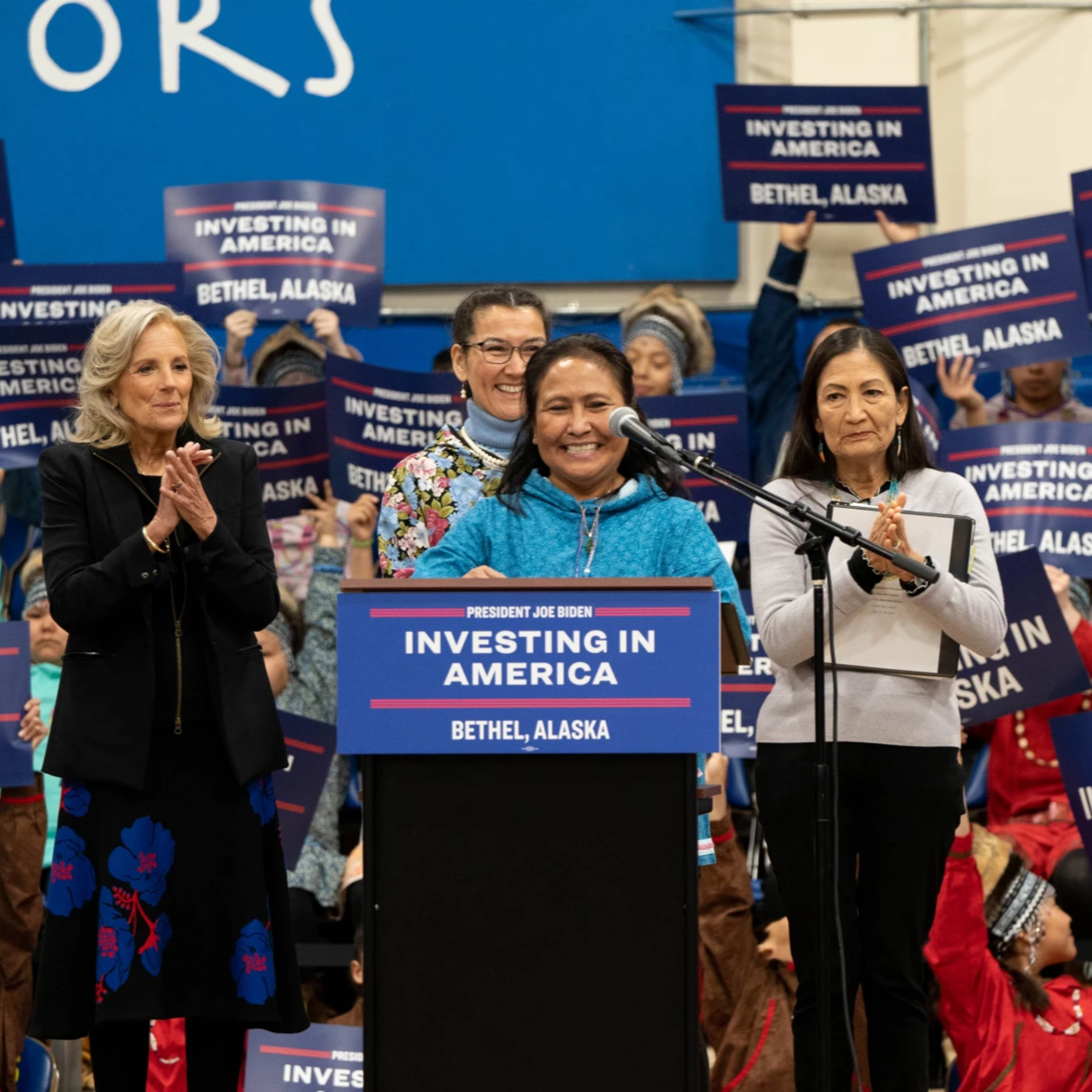 Photo: First lady of Alaska Rose Dunleavy, Rep. Mary Peltola, and Bethel Native Corporation president and CEO Ana Hoffman joined first lady Dr. Jill Biden and Interior Secretary Deb Haaland at the Investing in America event on May 17, 2023 in Bethel, Alaska.