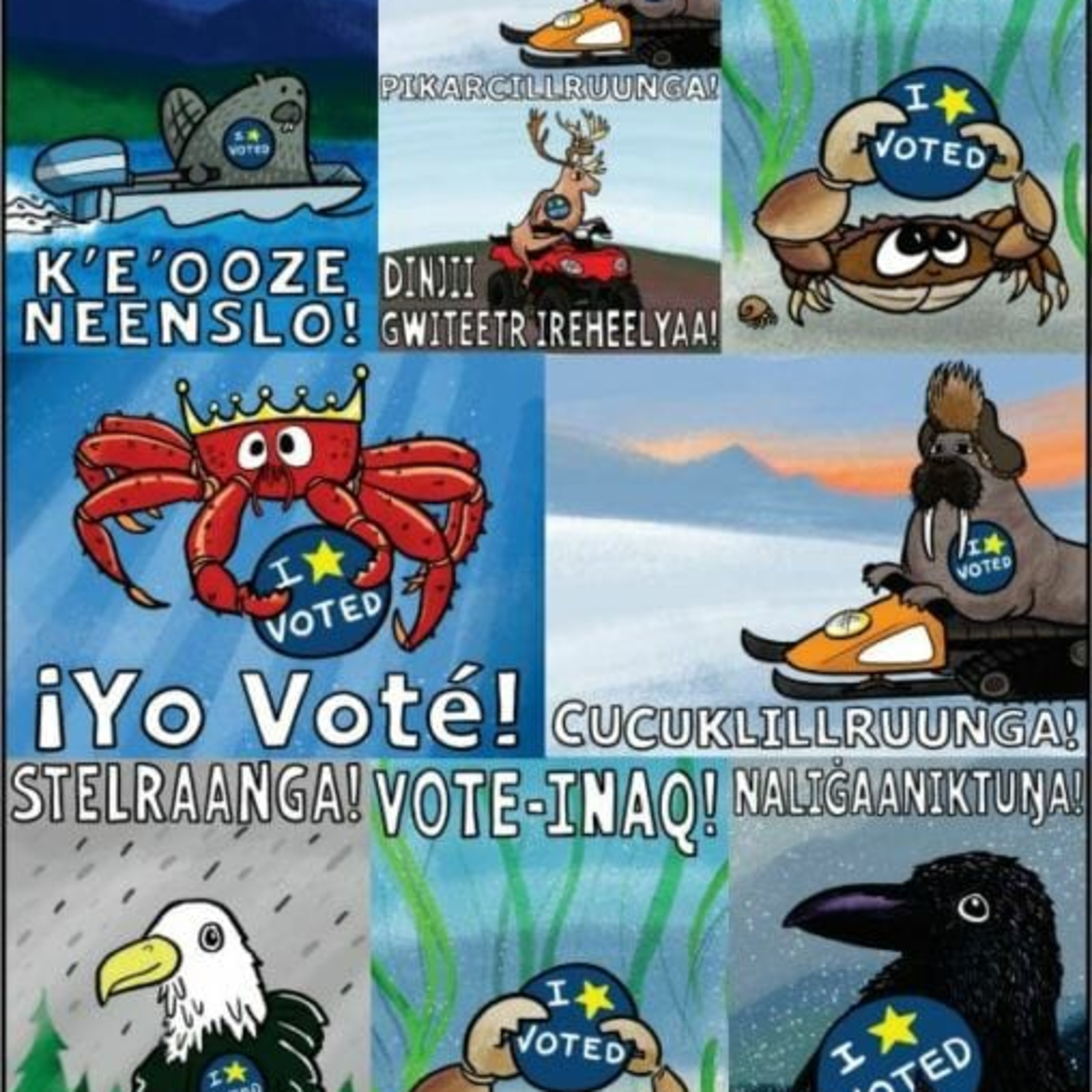 Photo: Early Voting stickers say “I voted” in English, Spanish, Tagalog and several Alaskan Native languages. The stickers were designed by Pat Race and translated by the Division of Elections. (Image courtesy of Alaska Division of Elections)