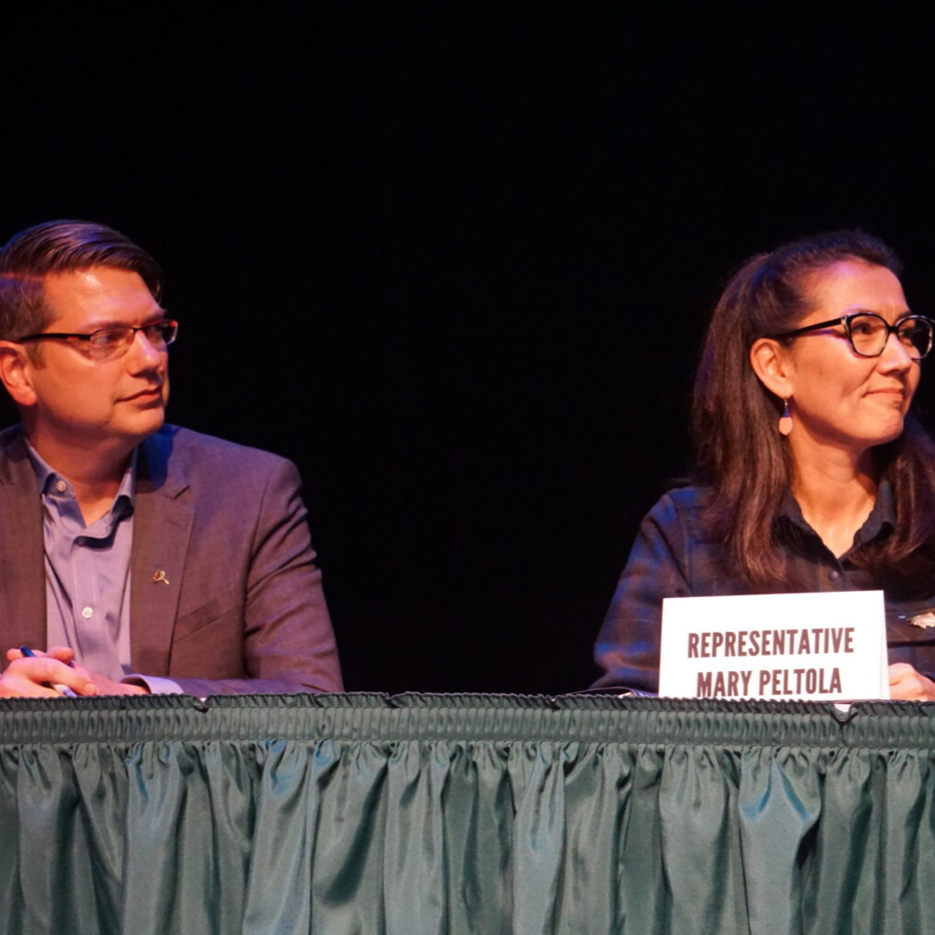 Photo: Candidate Nick Begich and U.S. Rep. Mary Peltola listen to the moderator at a 2022 debate in Kodiak. (Photo by Yereth Rosen/Alaska Beacon)