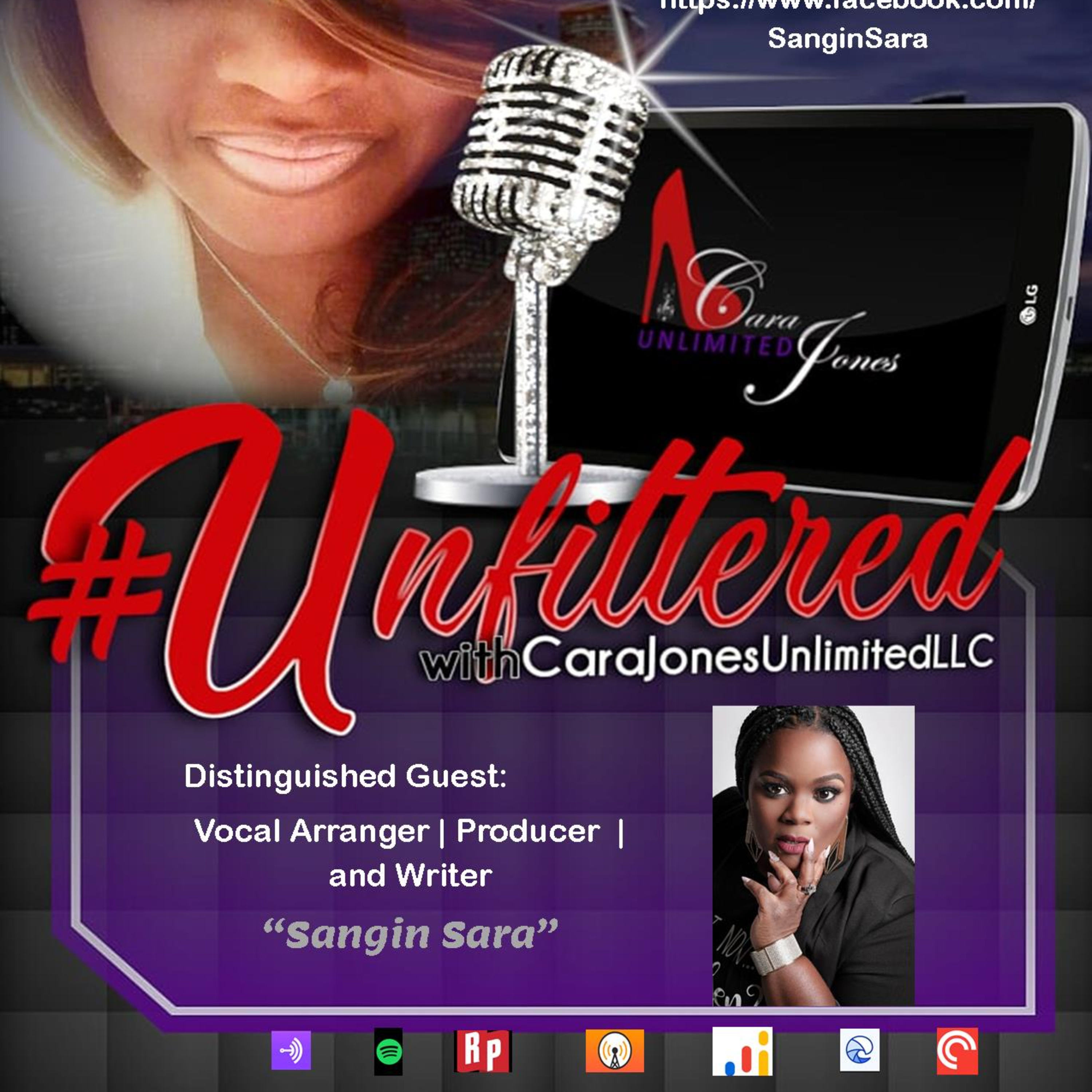 The "UNFILTERED with Cara Jones Unlimited, LLC Podcast" excitedly takes a #virtual #roadtrip to the home of its Producer, Chondra A. Perdue, MPA MS ALC... to the Greater San Francisco Bay Area for an #exclusive #interview with #vocalarranger #producer and #writer "SANGIN SARA"! Sara is currently an #international #touring #background #singer for twleve time #grammy #nominated #artist, #Ledisi and serves as the #background #vocaldirector for #DaveHollister.. and #sings with many other #esteemed #artists, such as #MsAnitaWilson #Ndambi and #RahsaanPatterson ! These are just a FEW of her many #entertainment #industry #accomplishments .... to hear the rest... join the #conversation on the #night of SATURDAY, OCTOBER 3, 2020... 7pm (PST) 9pm (CST) 10pm (EST) 4am (GMT}... via Sara's FACEBOOK page at https://www.facebook.com/SanginSara ! 💜💋🖤🎤🎧💚🌉