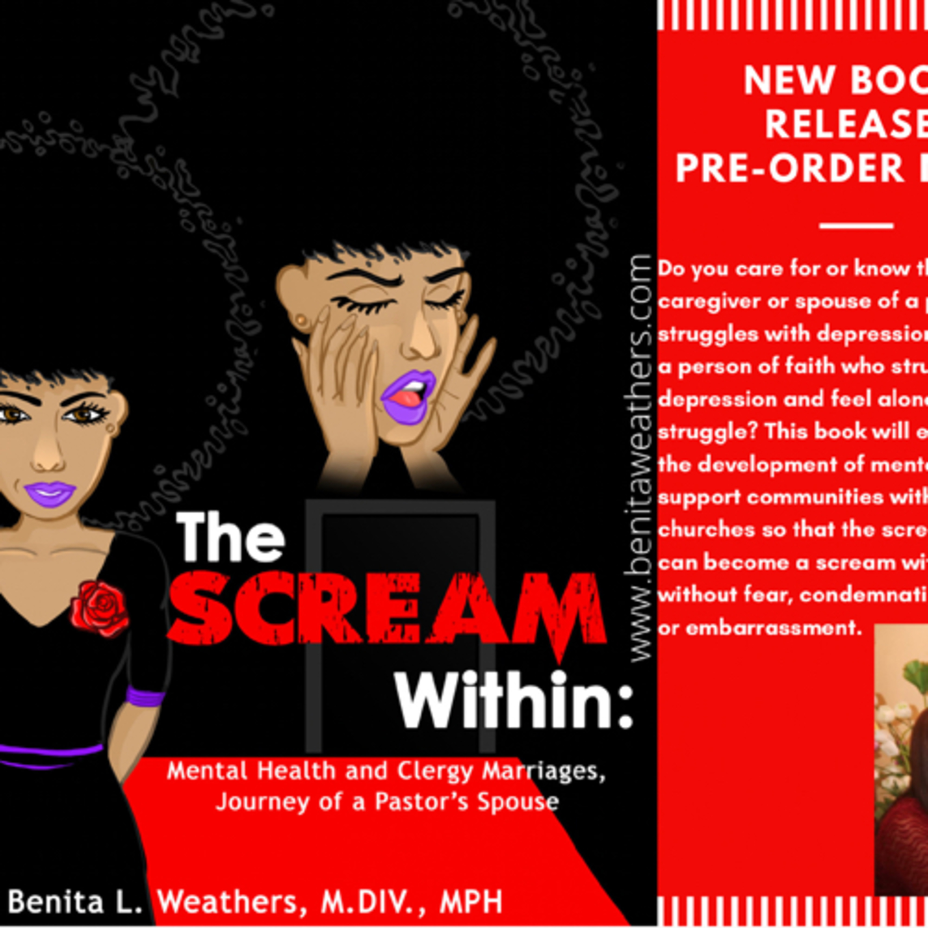 I thought Mother’s Day would be fitting to announce the birth of my new book! I’m super excited about it and hope you will be excited with me. There are many people in the Christian and other faith communities who battle depression alone. Those of us who are loved ones of people who battle depression are also deeply impacted. Take a walk with me through my journey as the spouse of a pastor who is conquering depression. It’s high time to stop the stigma and make the scream within a scream without- without condemnation, without fear, without ridicule, without embarrassment. I present to you, The Scream Within: Mental Health and Clergy Marriages, Journey of a Pastor’s Spouse, now available for presale. www.benitaweathers.com www.gloriousworkspublishing.com