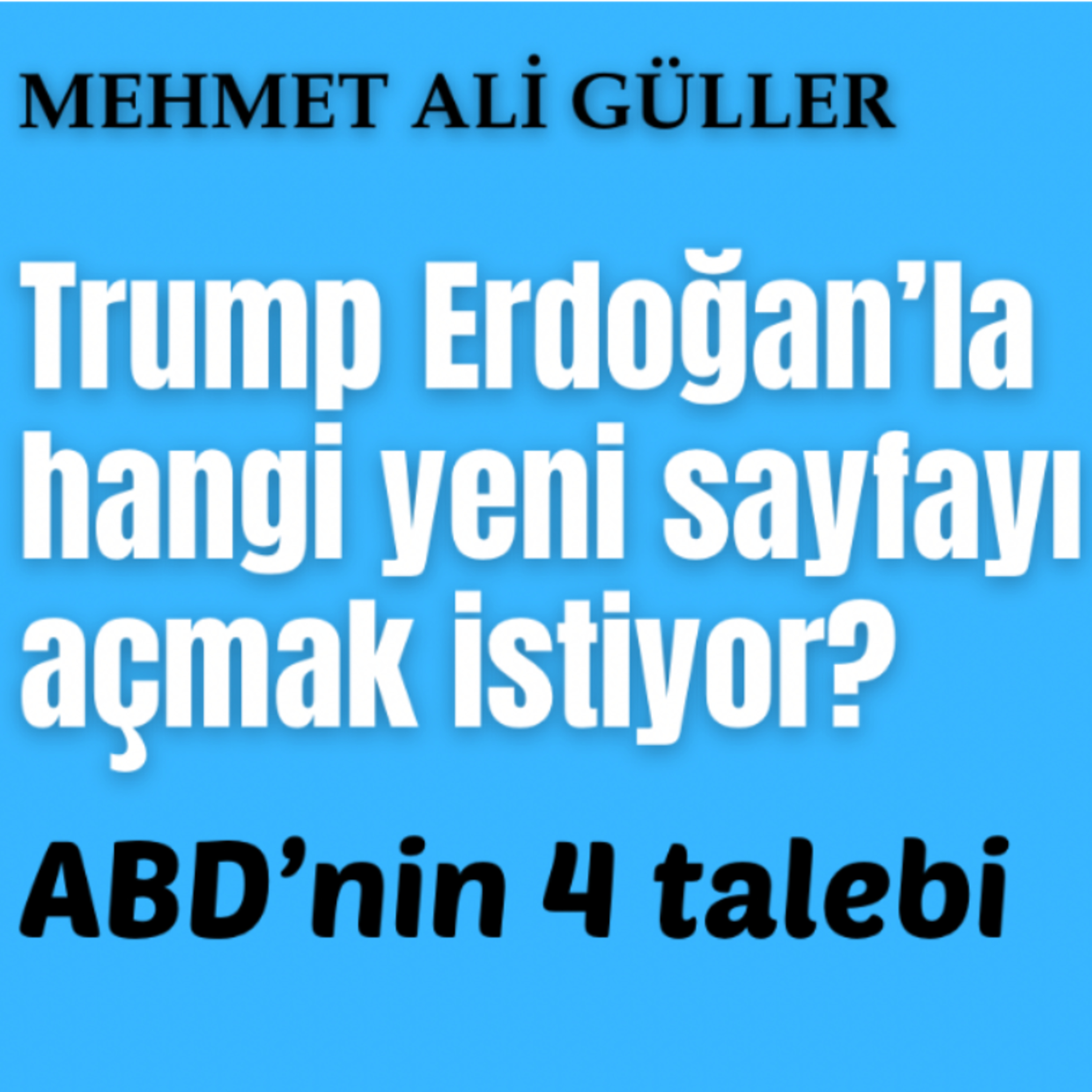 Trump Erdoğan’dan Geniş Ortadoğu’da planlarına destek istedi. Bunlar Rusya’yla işbirliğinin kesilmesi, Suriye’de İsrail’in lehine bir çözüme destek, Gazze’de İsrail’in lehine plana destek ve İsrail lehine İran’a karşı cepheye destek.