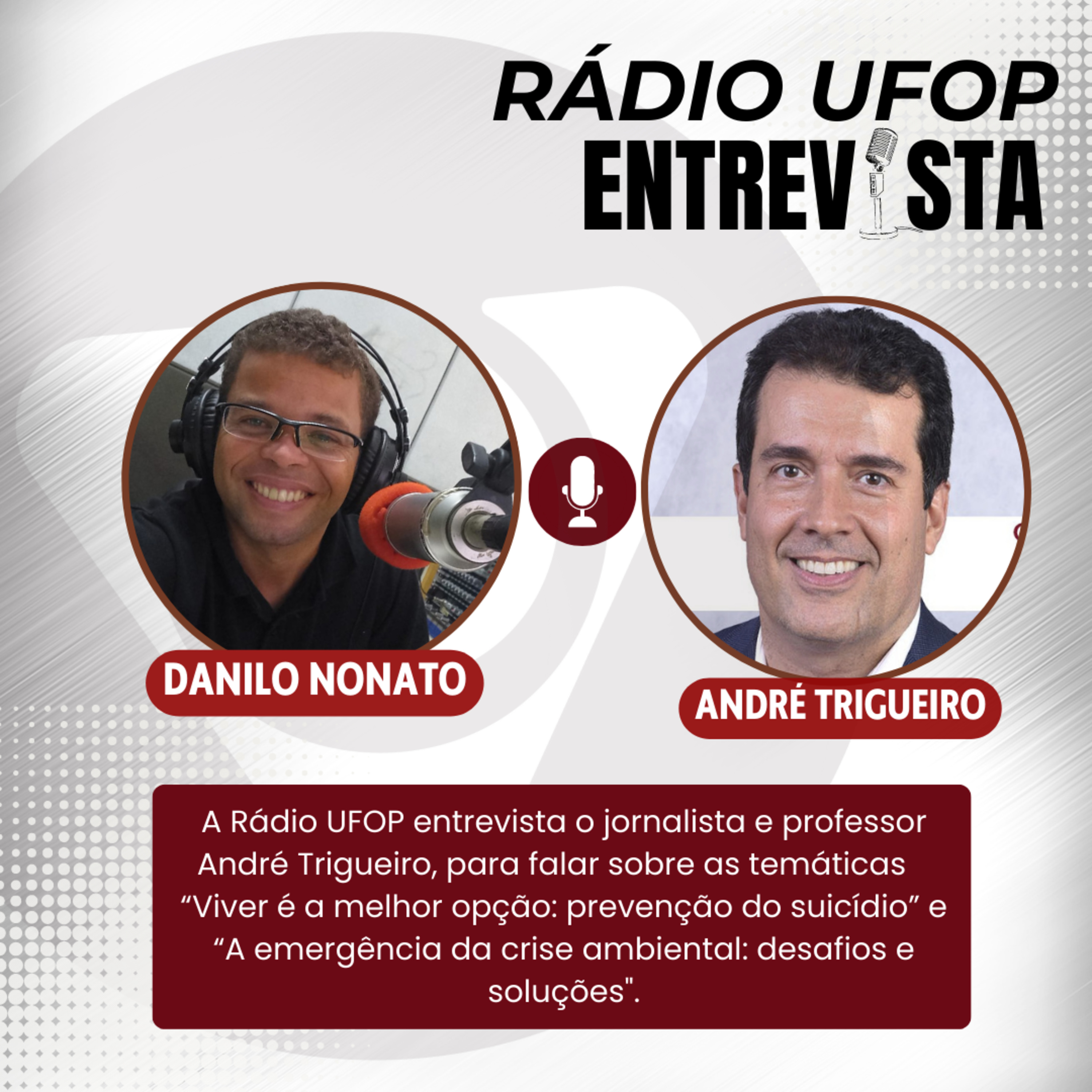 A Rádio UFOP entrevista o jornalista e professor André Trigueiro. Nesta quarta-feira, às 19 horas, teremos no Centro de Convenções da UFOP a palestra "Viver é a Melhor Opção - A prevenção do suicídio". E na quinta-feira, às 9h30, a palestra "A Emergência da Crise Ambiental: Desafios e soluções", ambas ministradas por Trigueiro.