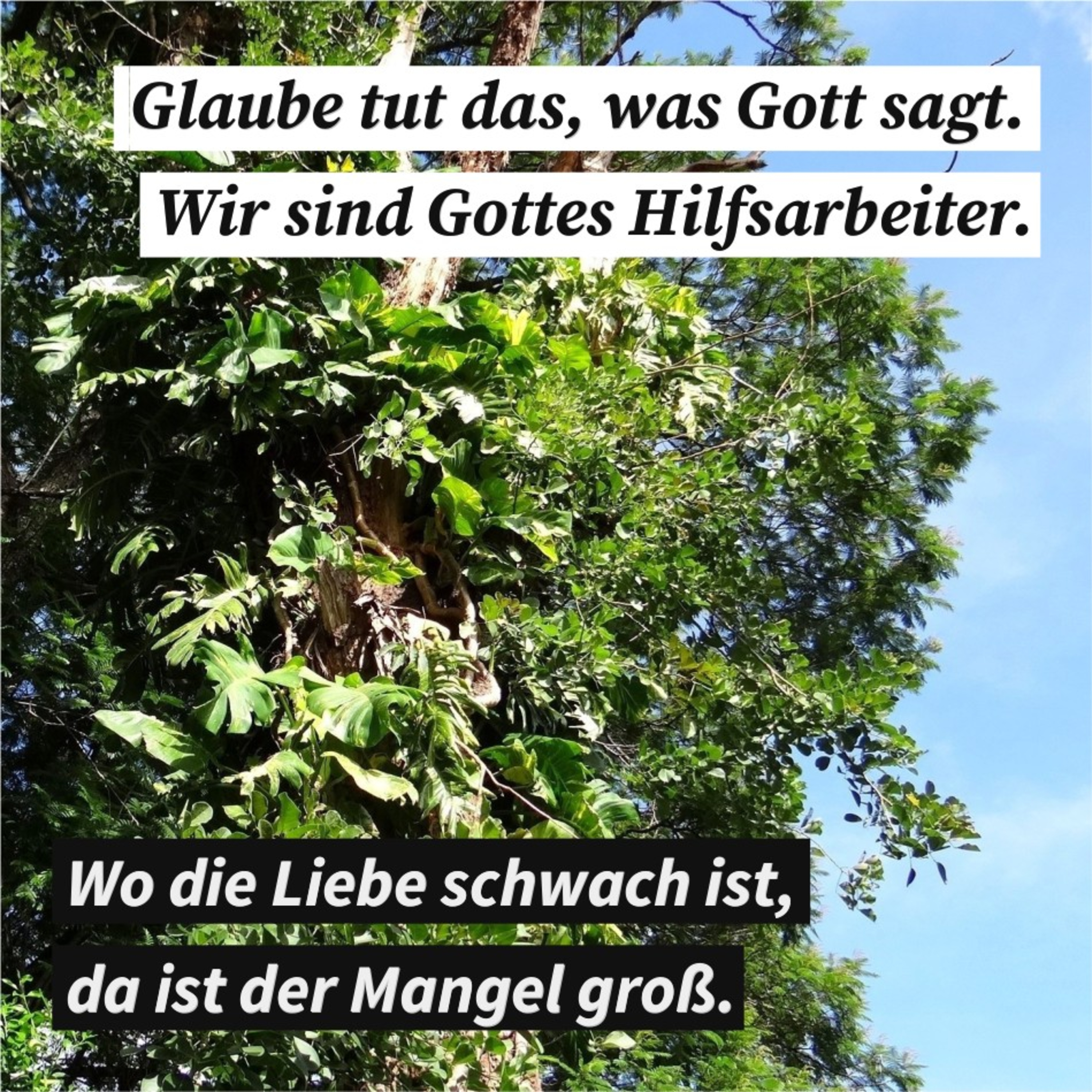Glaube tut das, was Gott sagt. Von nichts kommt nichts. Wir sind Gottes Hilfsarbeiter. Wo die Liebe schwach ist, da ist der Mangel groß.