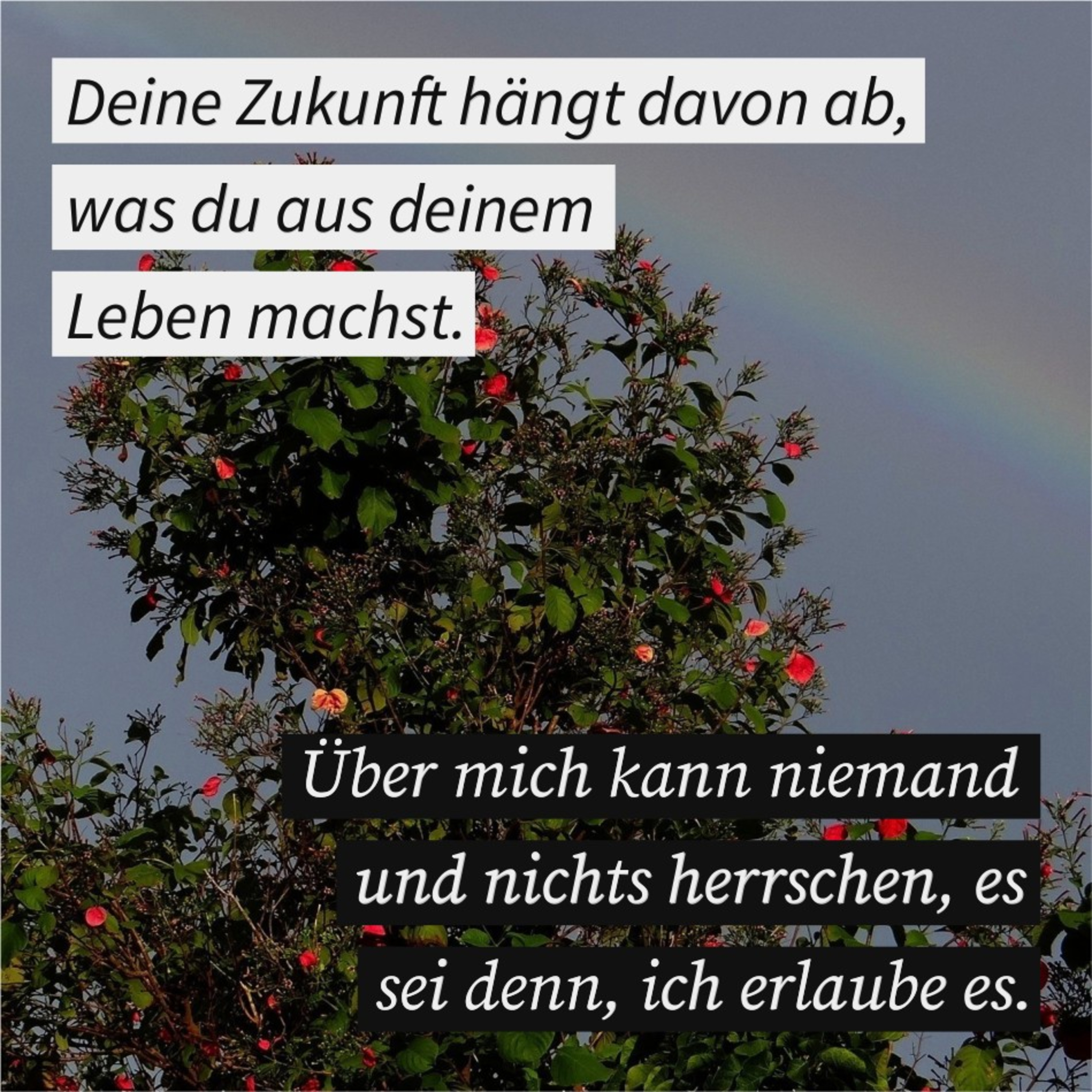 Deine Zukunft hängt davon ab, was du aus deinem Leben machst. Über mich kann niemand und nichts herrschen, es sei denn, ich erlaube es.