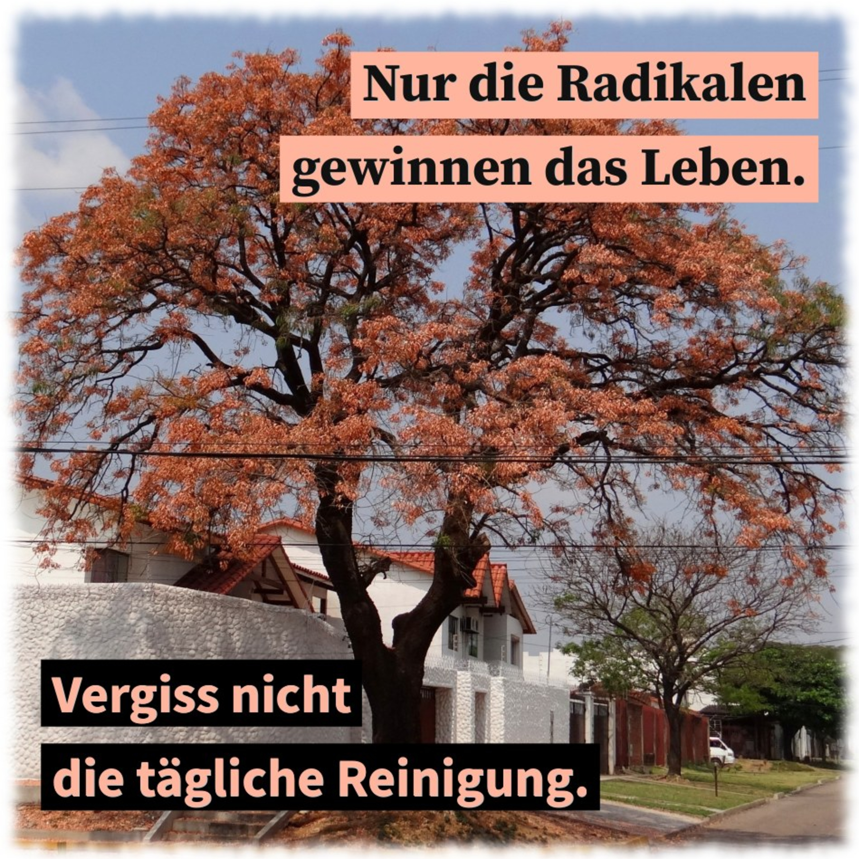 Nur die Radikalen gewinnen das Leben. Vergiss nicht die tägliche Reinigung. Nur wer dich liebt, meint es gut mit dir.
