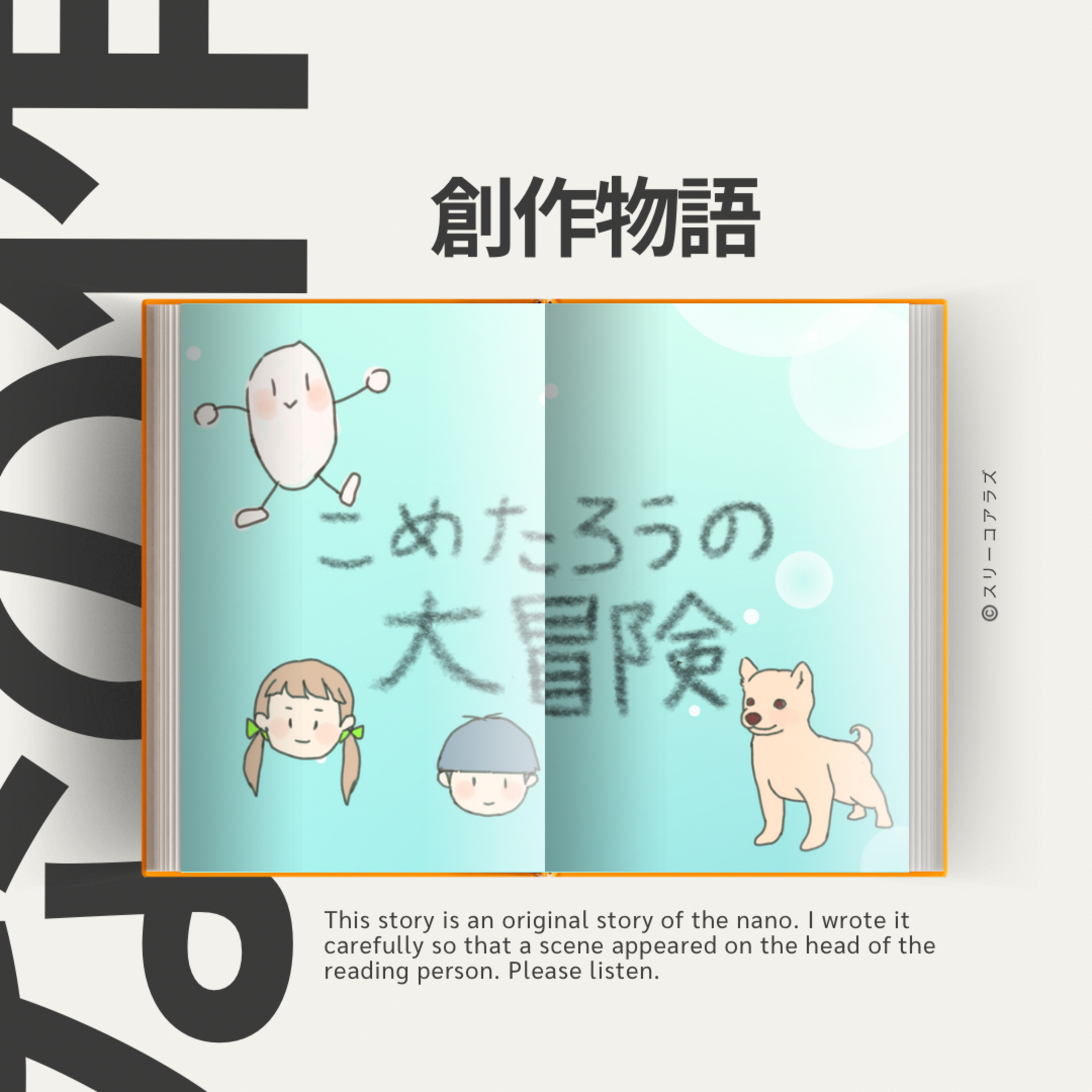 をお送りします。物語を聞いている人の頭の中に、場面が浮かぶように気をつけて書きました。配役もナノが考えました。楽しく聞いてもらえたら嬉しいです。是非聞いてね!
