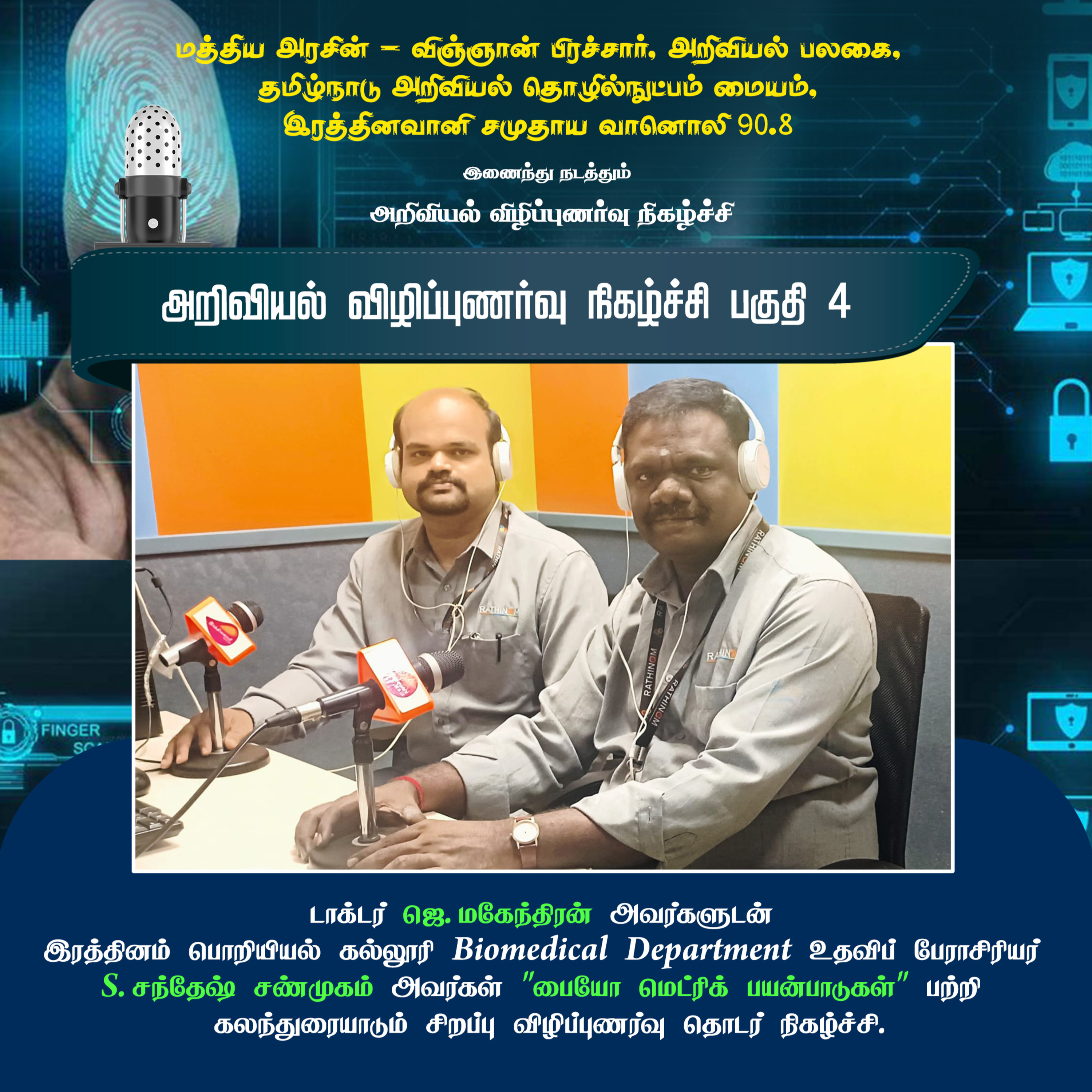 அறிவியல் விழிப்புணர்வு நிகழ்ச்சி பகுதி 4 | " டாக்டர் ஜெ. மகேந்திரன் அவர்களுடன் இரத்தினம் பொறியியல் கல்லூரி Biomedical Department உதவிப் பேராசிரியர் S. சந்தேஷ் சண்முகம் அவர்கள் "பையோ மெட்ரிக் பயன்பாடுகள் " பற்றிகலந்துரையாடும் சிறப்பு விழிப்புணர்வு தொடர் நிகழ்ச்சி. | நிகழ்ச்சி தொகுப்பு ஜெ.மகேந்திரன், நிலைய இயக்குனர் இரத்தினவானி சமுதாய பண்பலை 90.8CR. தொடர்புக்கு - 8838078388 |
