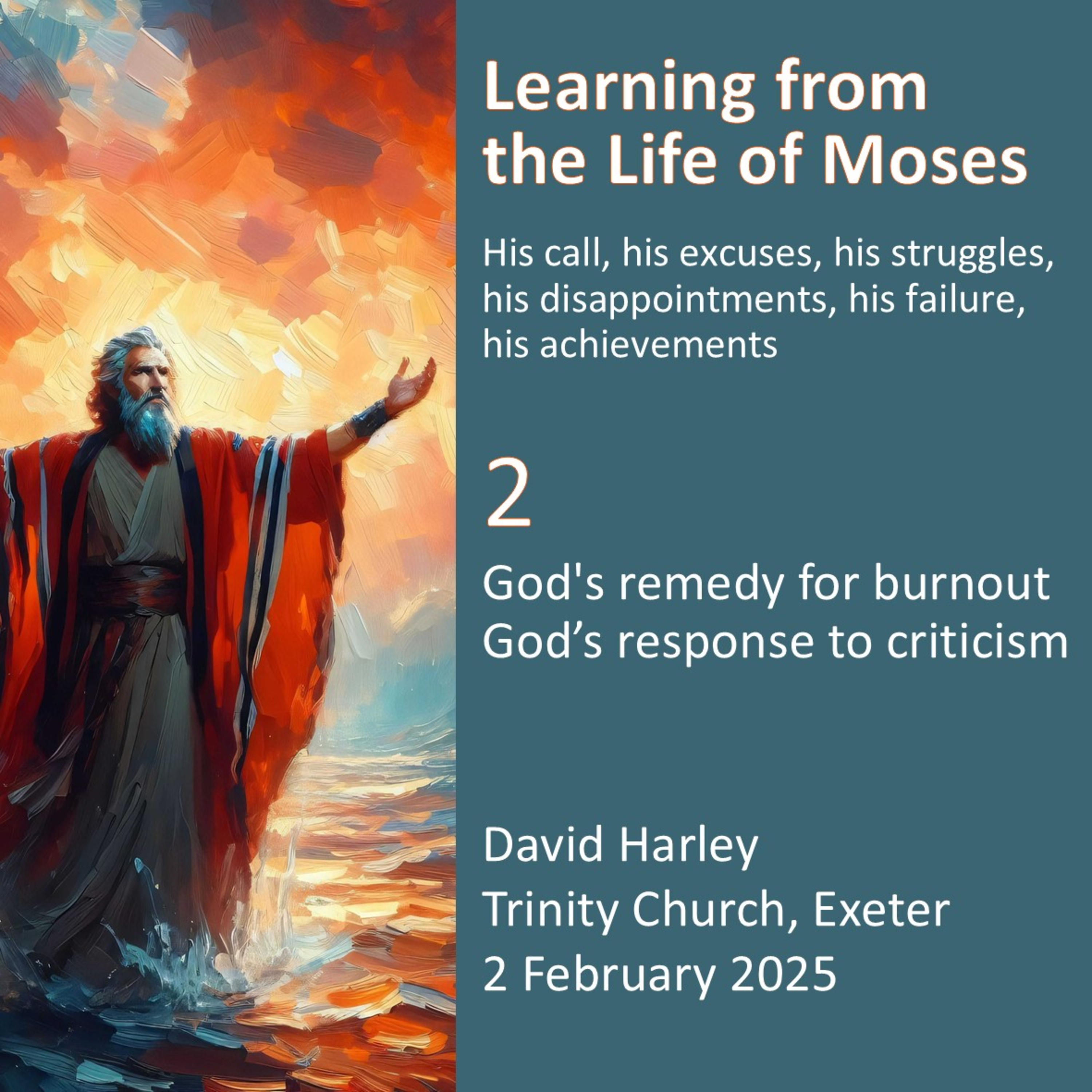 Over 3 Sunday evenings, starting on 26 January 2026, The Revd David Harley helps us to learn from the life of Moses considering his call, his excuses, his struggles, his disappointments, his failure and his achievements’