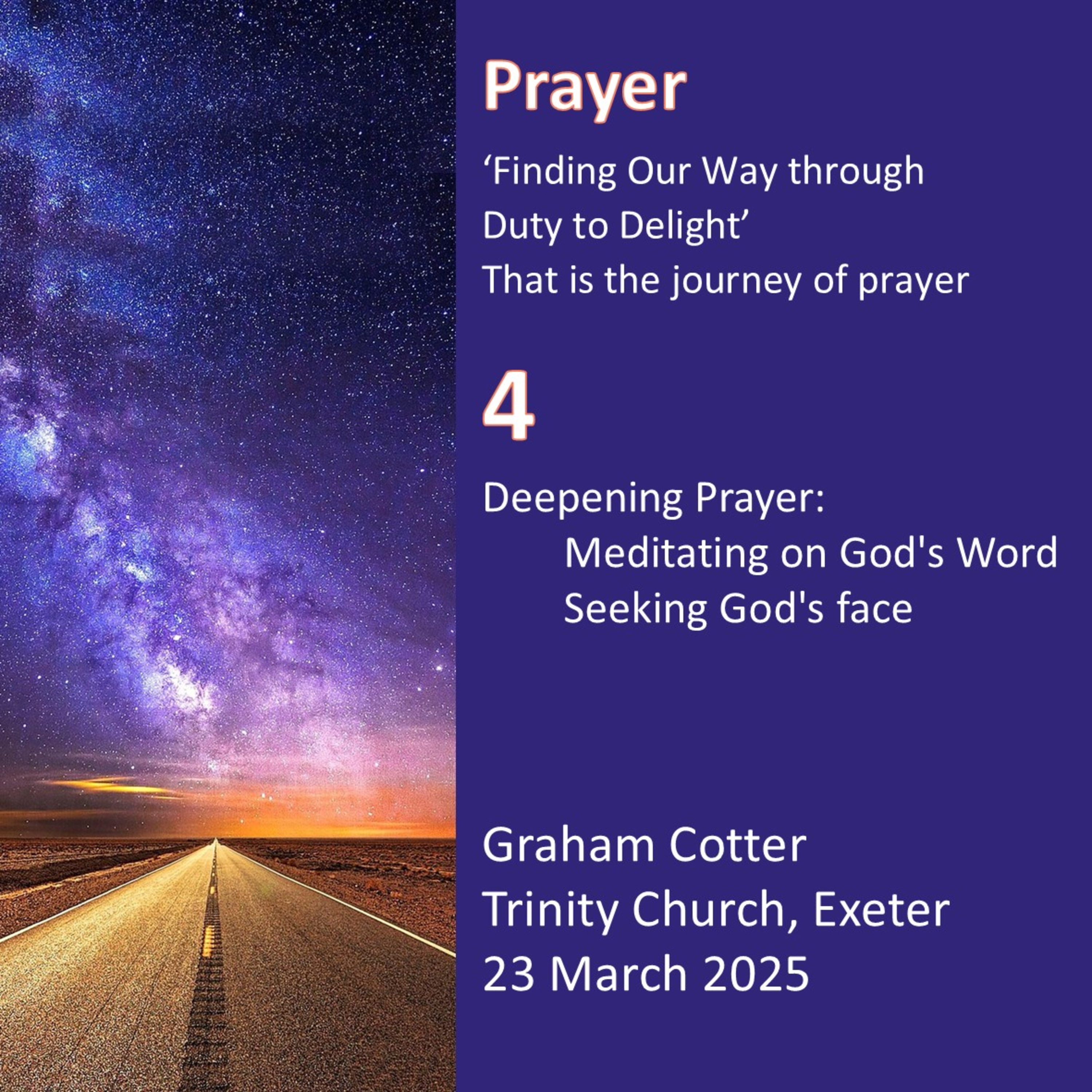 Over 5 Sunday evenings, starting on 2 March 2025, we look at prayer. We will be using Tim Keller’s book on prayer in which he quotes from J I Packer & Carolyn Nystrom’s book–‘Prayer is finding our way though duty to delight; that is the journey of prayer’