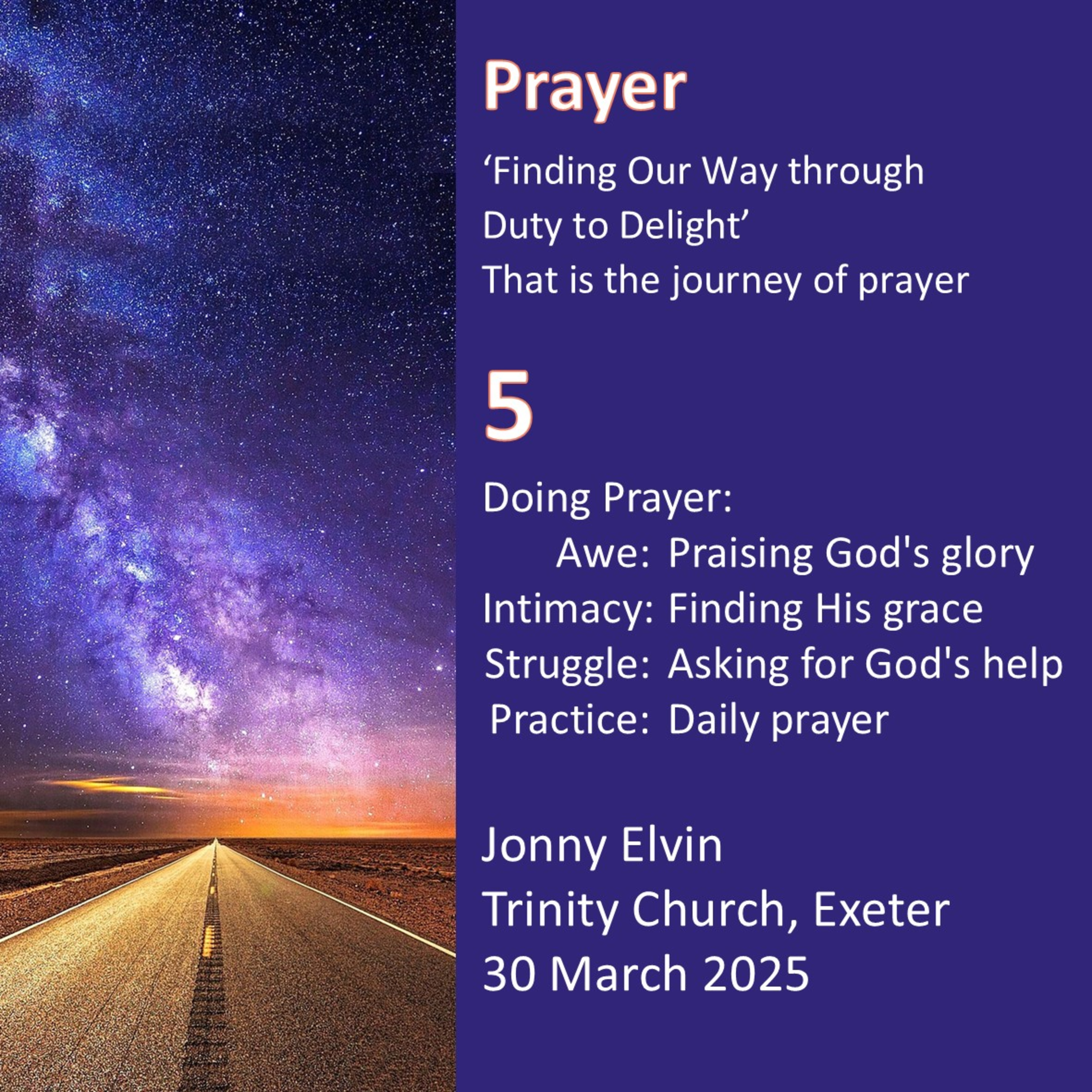 Over 5 Sunday evenings, starting on 2 March 2025, we look at prayer. We will be using Tim Keller’s book on prayer in which he quotes from J I Packer & Carolyn Nystrom’s book–‘Prayer is finding our way though duty to delight; that is the journey of prayer’