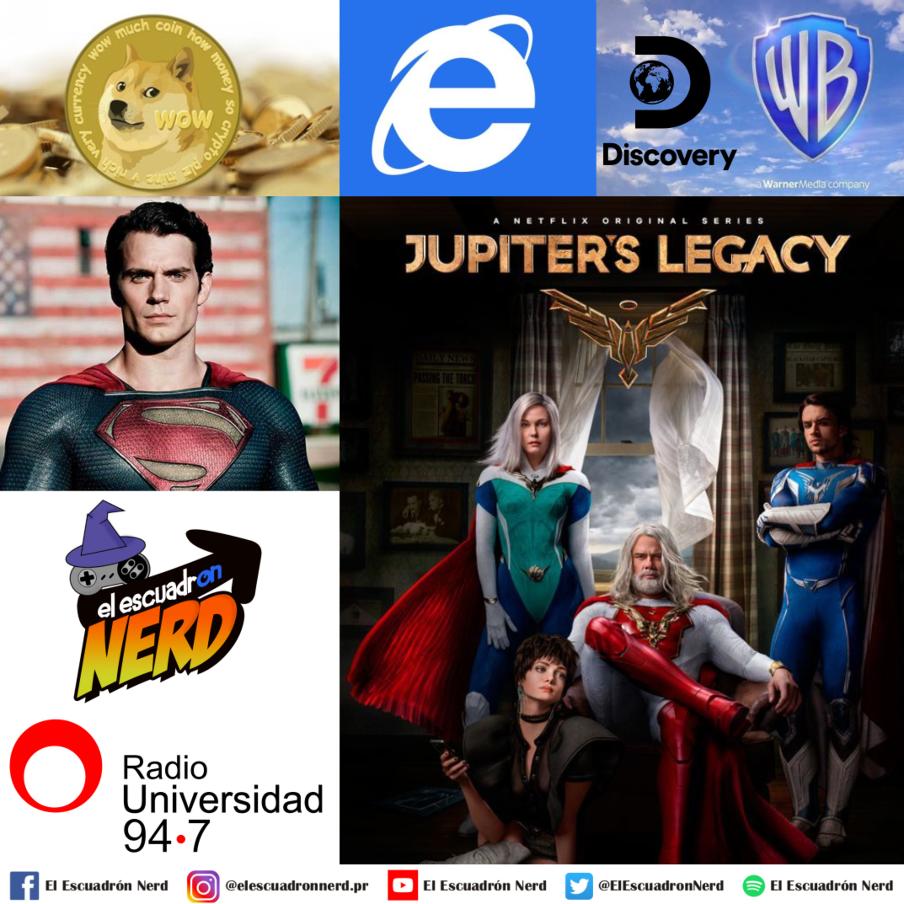 En el programa del 23 de Mayo en Radio Universidad Tucumán, fm 94.7, charlamos de un nuevo capítulo del final de relación entre Henry Cavill y Warner Bros, nerdeamos con el estreno Jupiter´s Legacy, la nueva serie de supehéroes de Netflix, y hablamos de la unión entre Warner y Discovery, además le decimos adiós a internet explorer y nos enteramos de Doge, la cripto-moneda nacida de un meme.