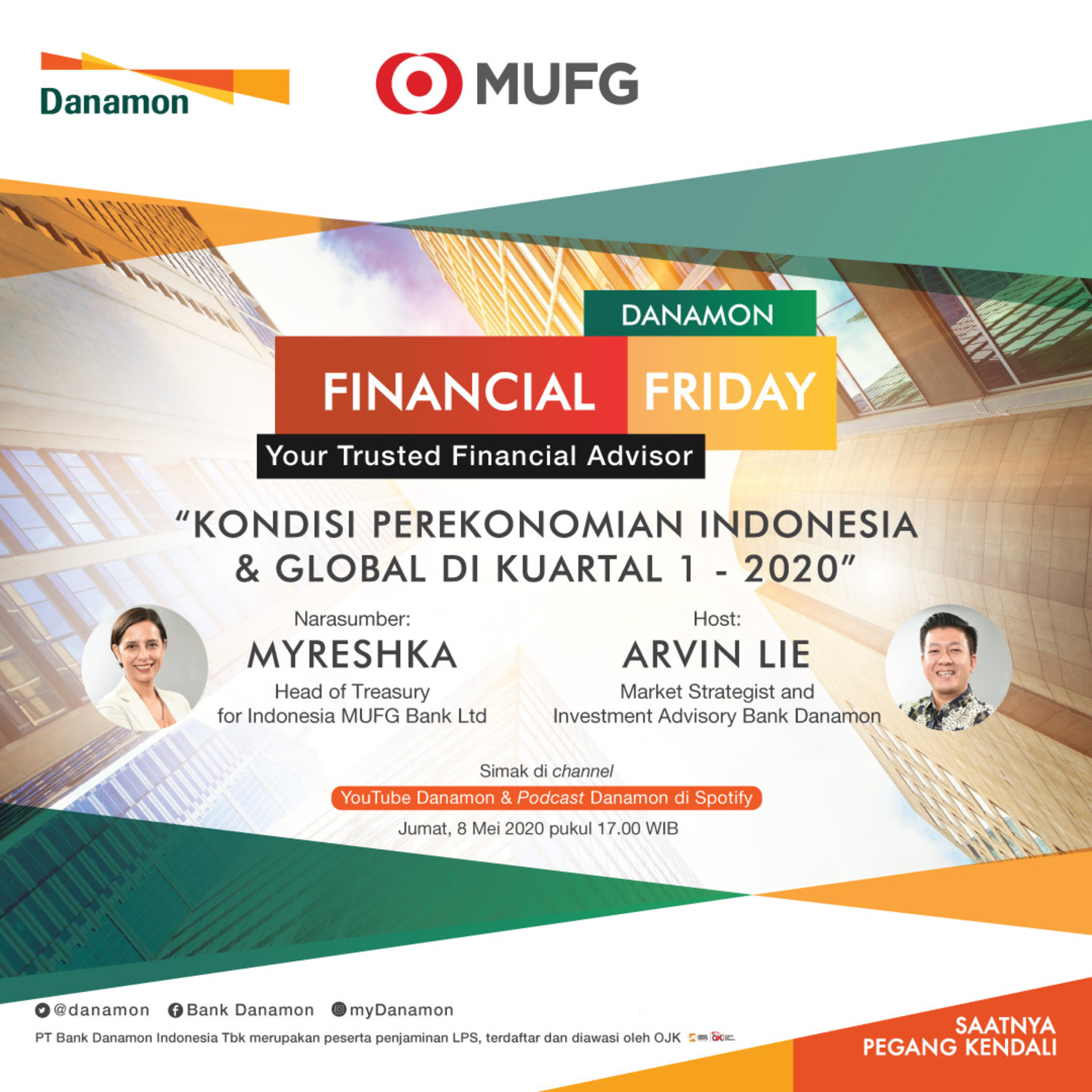 Memperingati 1 tahun kolaborasi antara Bank Danamon dengan MUFG, a global financial group, Danamon Financial Friday kali ini akan membahas "Kondisi Perekonomian Indonesia & Global di Kuartal 1 - 2020" bersama Myreshka - Head of Treasury for Indonesia MUFG Bank Ltd.