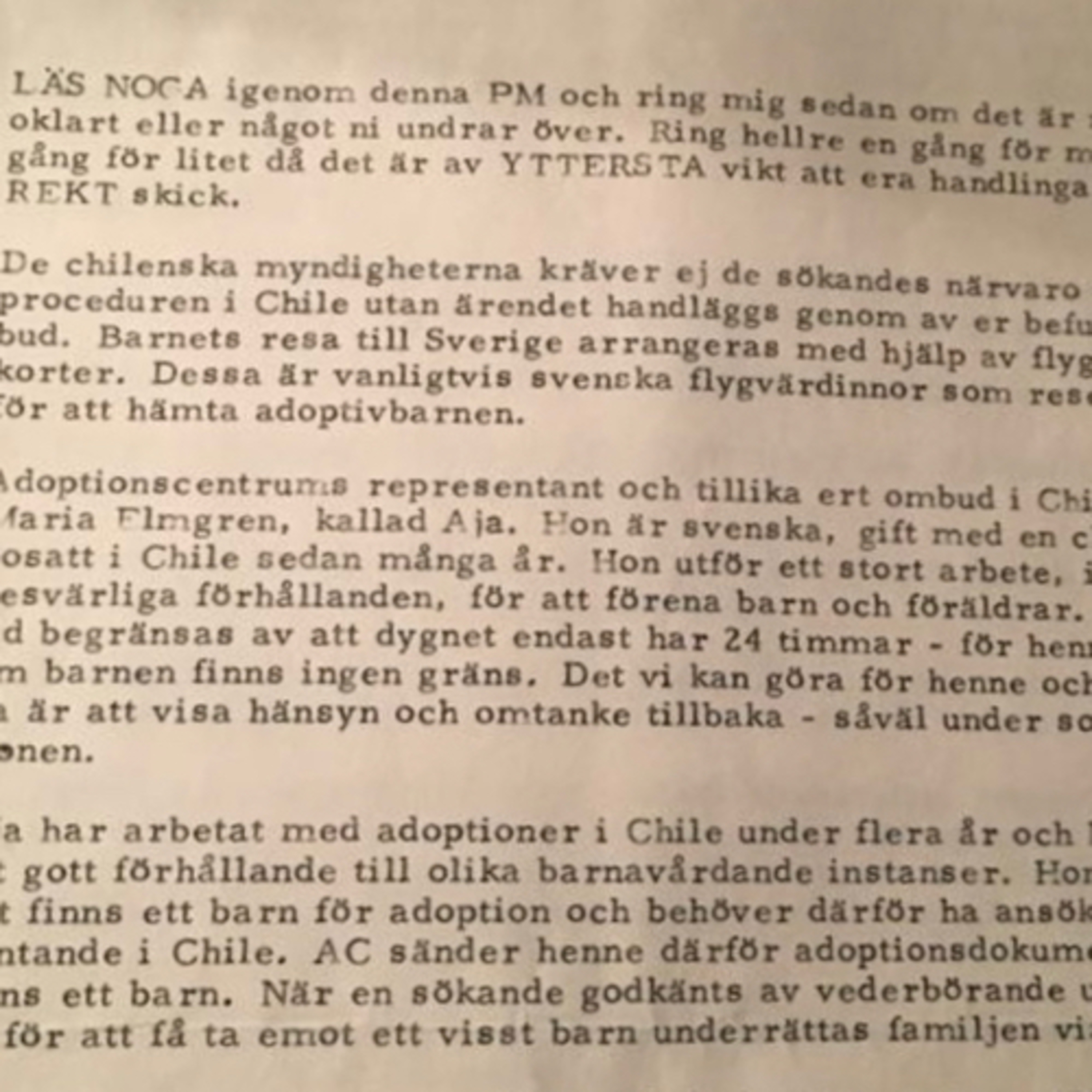 Alla drygt 2000 barn som kom från Chile till Sverige, genom adoptionsbyrån Adoptionscentrum har namnet på deras svenska anställda kvinna i sina papper: Anna Maria, Aja. Detta avsnitt handlar om denna kvinna och olika dokument som finns tillgängliga: Ett chilenskt examensarbete från 2003, Ett PM från Adoptionscentrum, en stämningsansökan där den svenska kvinnan stämmer chilensk TV.