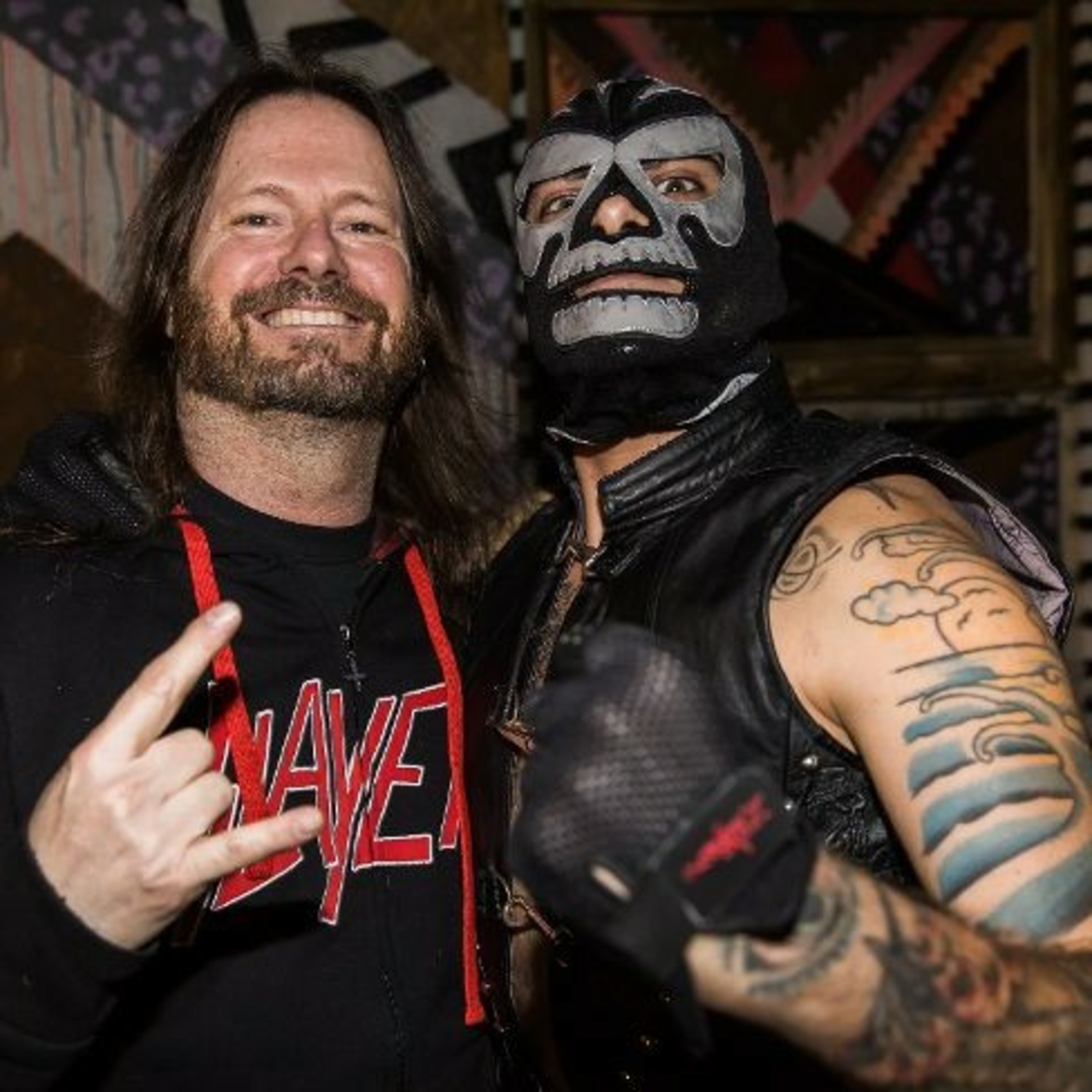 Auf dem Foto ist er als der Show-Charakter El Brujo mit Gary Holt von Slayer zu sehen. Wohl bekommt's! Nachtisch gibt's auf www.therockandrollwrestlingbash.com