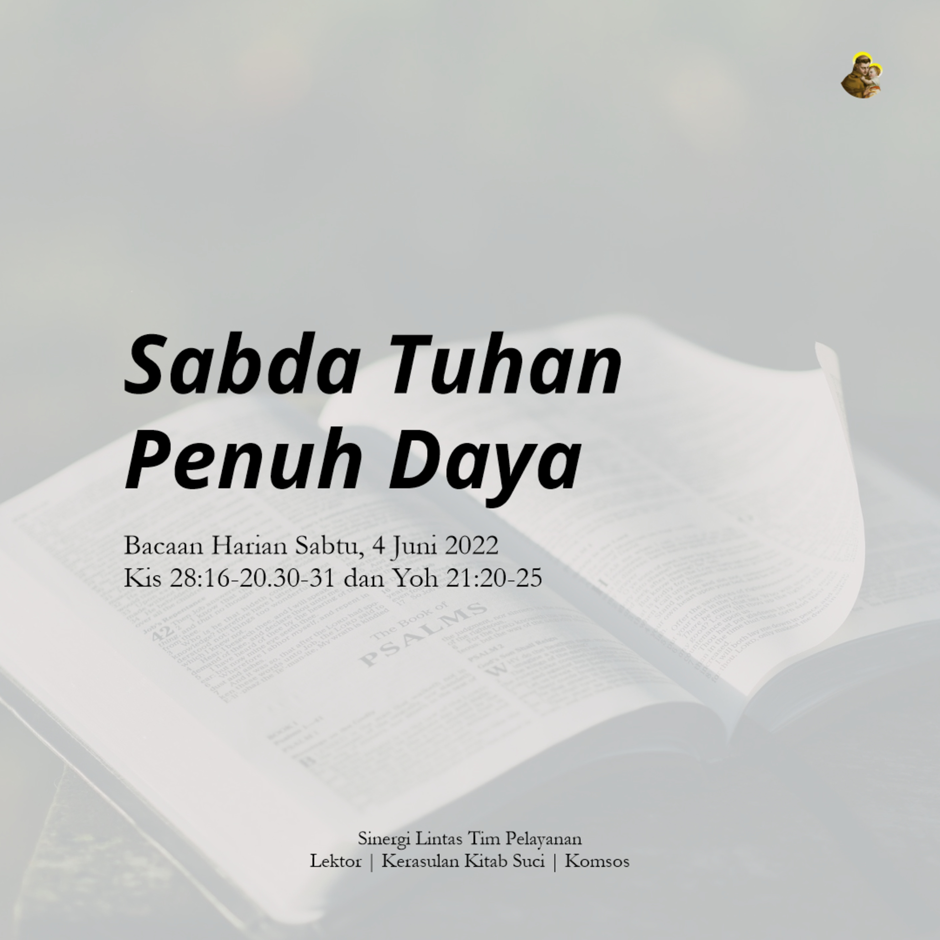 Audio ini merupakan hasil sinergi tim pelayanan yang ada di Gereja Kotabaru yaitu Lektor, Kerasulan Kitab Suci, dan Komsos. Semoga dengan adanya audio bacaan harian dan mingguan ini, umat dapat semakin rajin membuka, membaca, dan menghayati isi Kitab Suci. Tuhan memberkati!