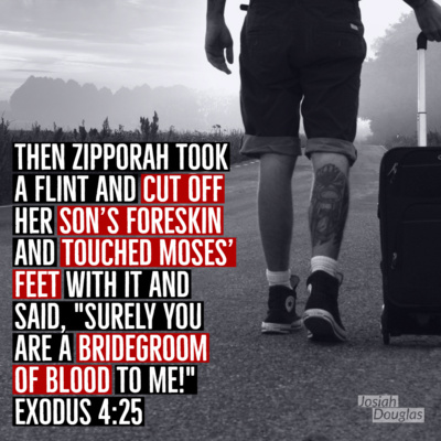 Then Zipporah took a flint and cut off her son's foreskin and touched Moses' feet with it and said, "Surely you are a bridegroom of blood to me!"