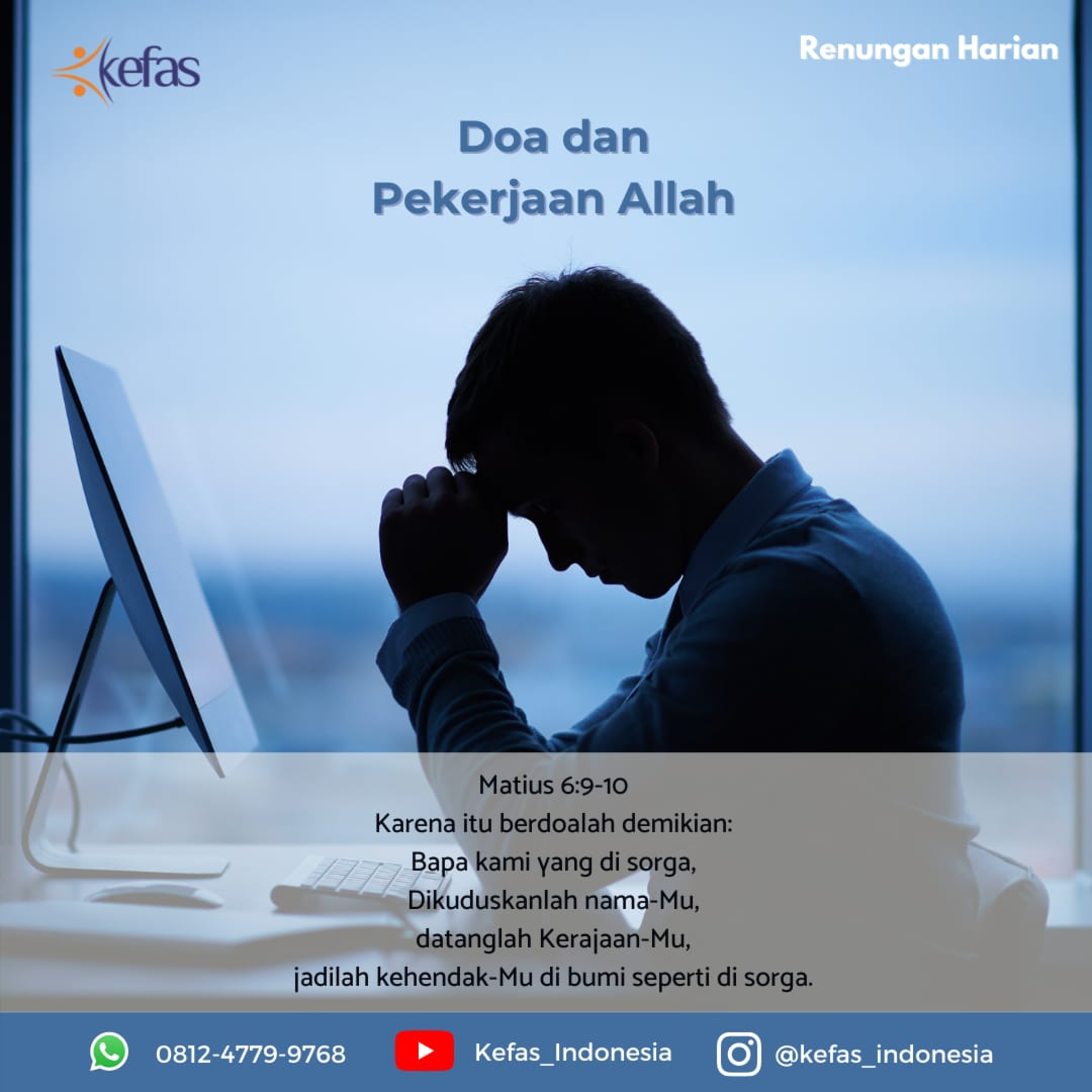 Karena itu berdoalah demikian: Bapa kami yang di surga dikuduskanlah nama-Mu, datanglah Kerajaan-Mu, jadilah kehendak-Mu di bumi seperti di surga.