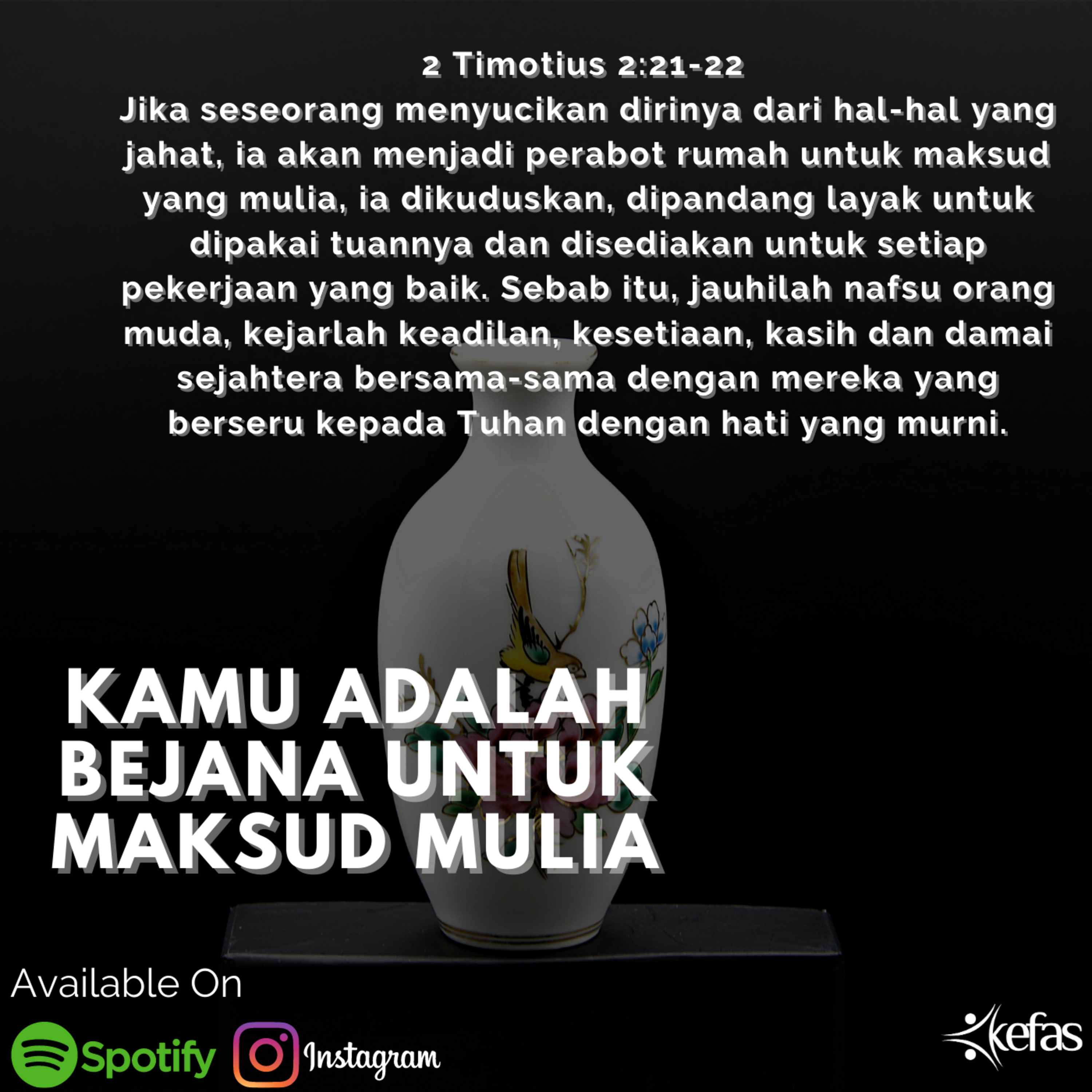 Bagaimana cara kita hari ini agar kita bisa dipakai Allah untuk maksud yang mulia? Dalam 2 Timotius 2:22 mengatakan “Sebab itu, jauhilah nafsu orang muda, kejarlah keadilan, kesetiaan, kasih dan damai sejahtera bersama-sama dengan mereka yang berseru kepada Tuhan dengan hati yang murni.” Haleluya, kiranya Tuhan mendapatkan kita bersama saudara-saudari dengan hati yang murni berseru kepada Tuhan, agar bejana kita semakin dipenuhi Tuhan bagi kemuliaan-Nya