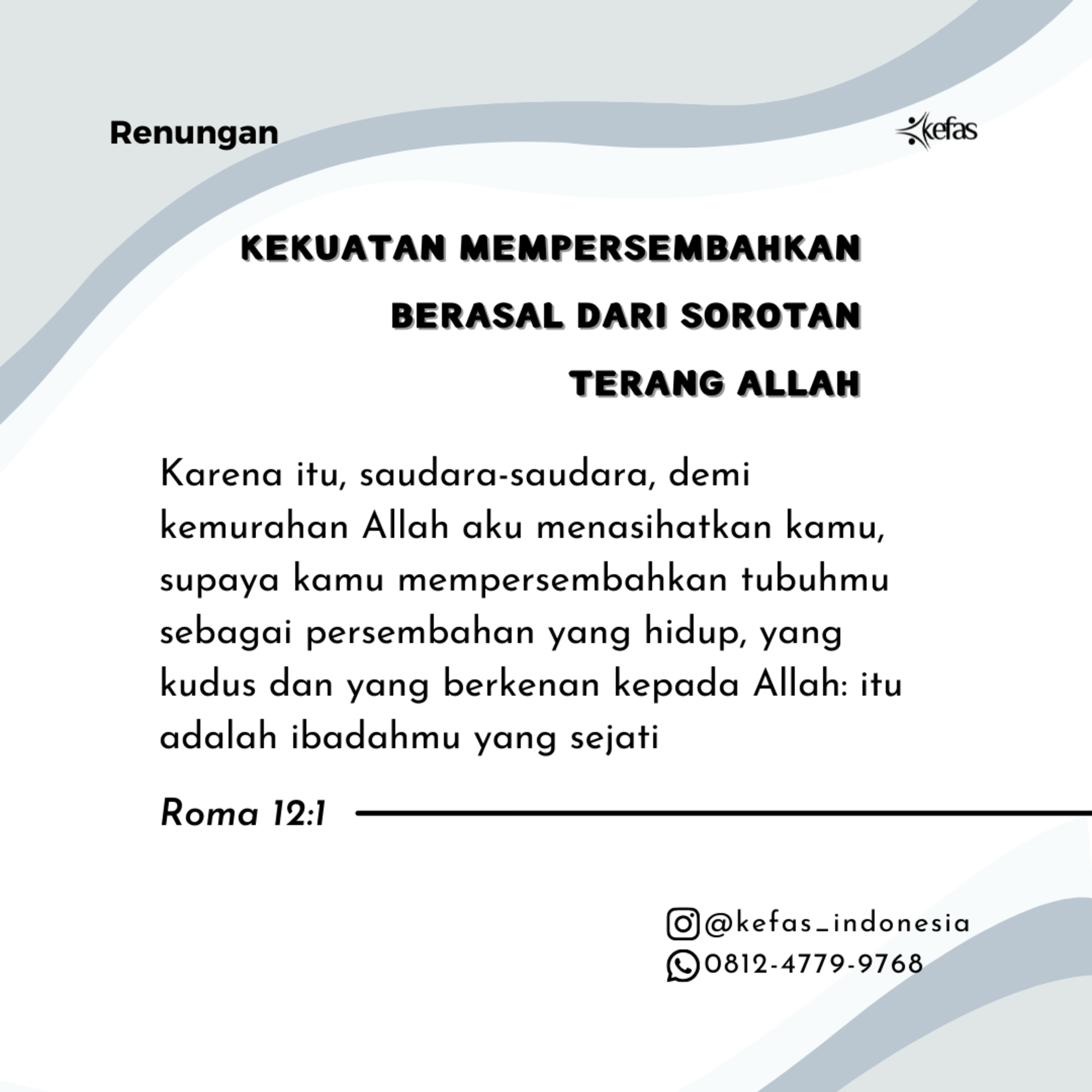 Karena itu, saudara-saudara, demi kemurahan Allah aku menasihatkan kamu, supaya kamu mempersembahkan tubuhmu sebagai persembahan yang hidup, yang kudus dan yang berkenan kepada Allah: itu adalah ibadahmu yang sejati