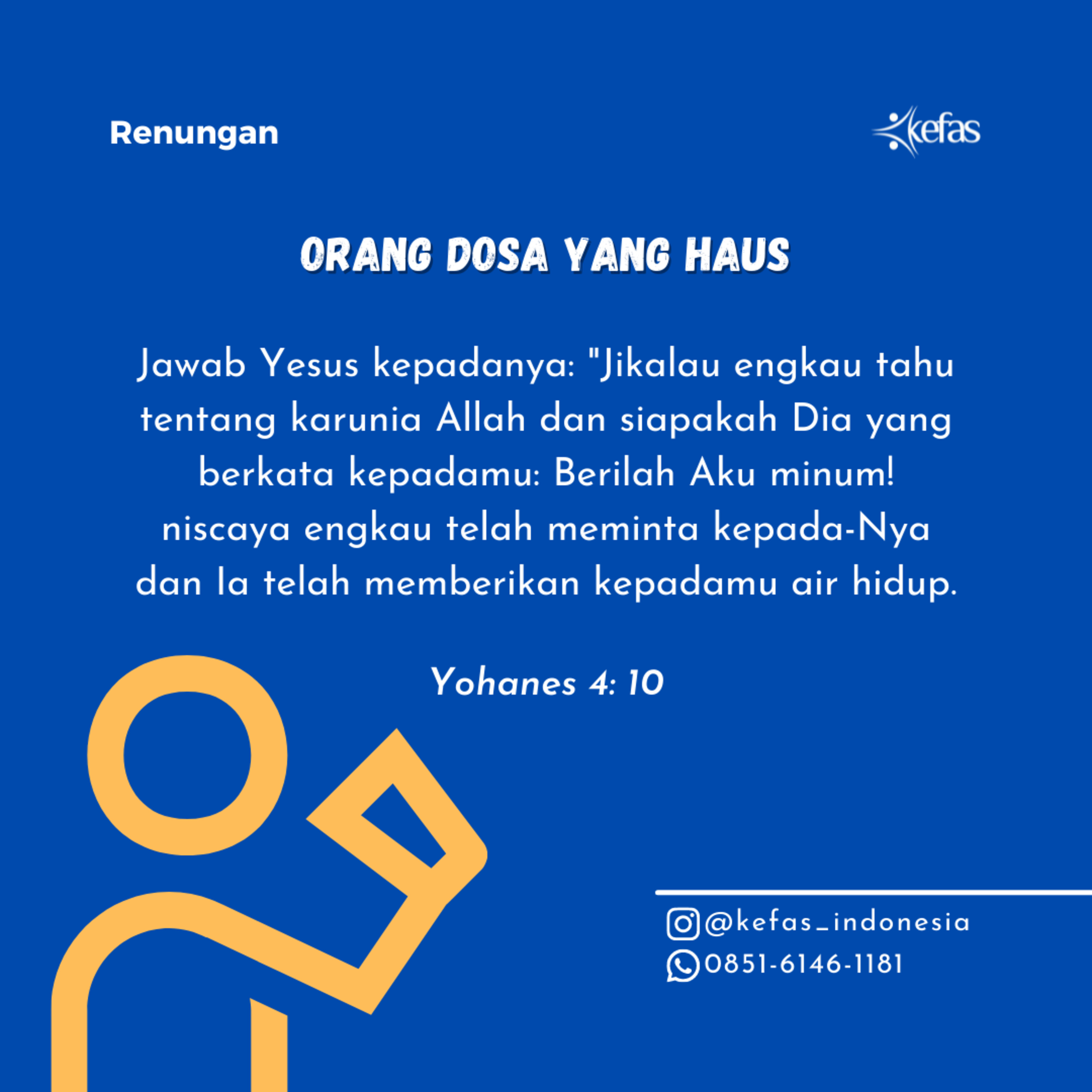 Jawab Yesus kepadanya: "Jikalau engkau tahu tentang karunia Allah dan siapakah Dia yang berkata kepadamu: Berilah Aku minum! niscaya engkau telah meminta kepada-Nya dan Ia telah memberikan kepadamu air hidup."