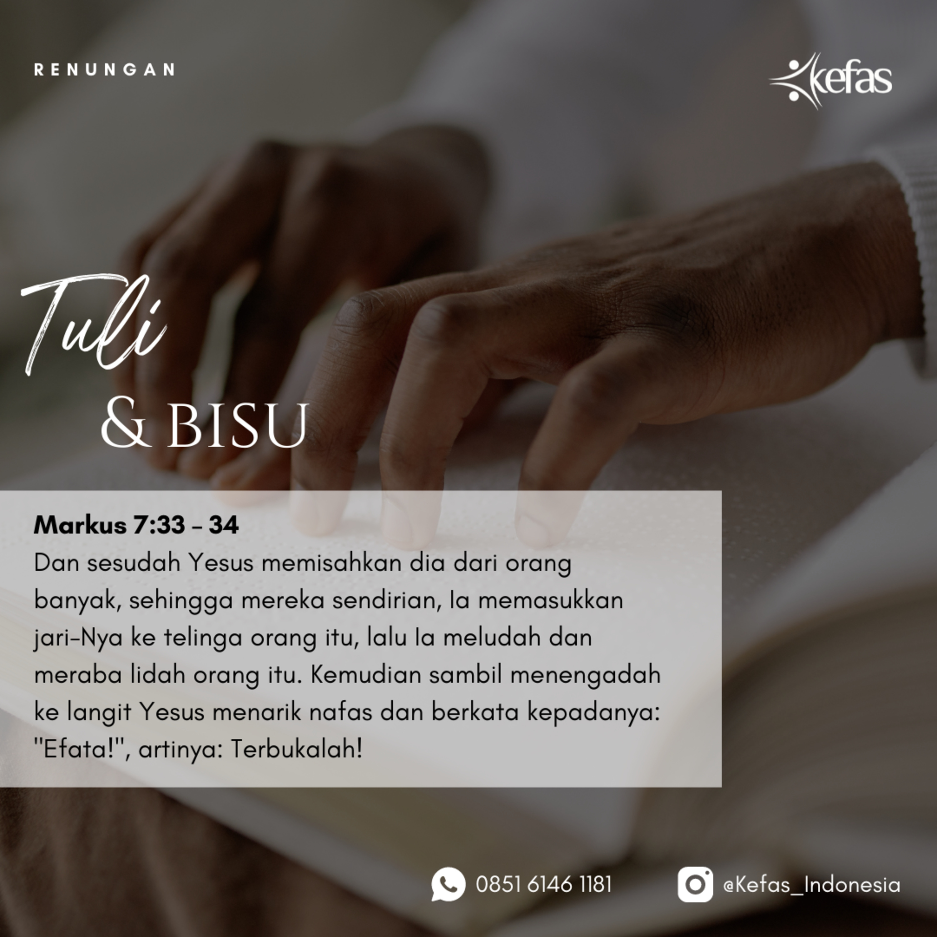 Dan sesudah Yesus memisahkan dia dari orang banyak, sehingga mereka sendirian, Ia memasukkan jari-Nya ke telinga orang itu, lalu Ia meludah dan meraba lidah orang itu. Kemudian sambil menengadah ke langit Yesus menarik nafas dan berkata kepadanya: "Efata!", artinya: Terbukalah!