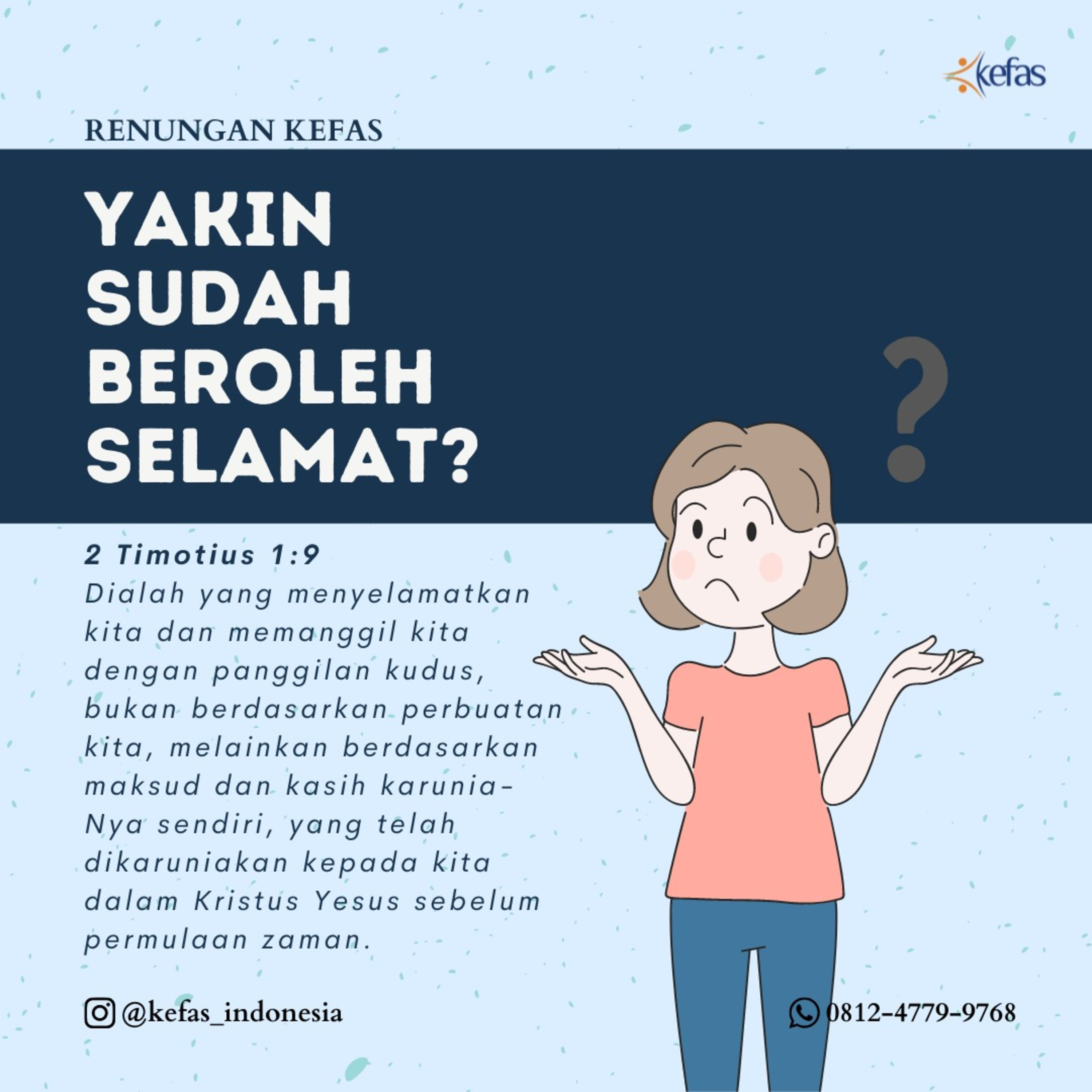 “Dialah yang menyelamatkan kita dan memanggil kita dengan panggilan kudus, bukan berdasarkan perbuatan kita, melainkan berdasarkan maksud dan kasih karunia-Nya sendiri, yang telah dikaruniakan kepada kita dalam Kristus Yesus sebelum permulaan zaman”