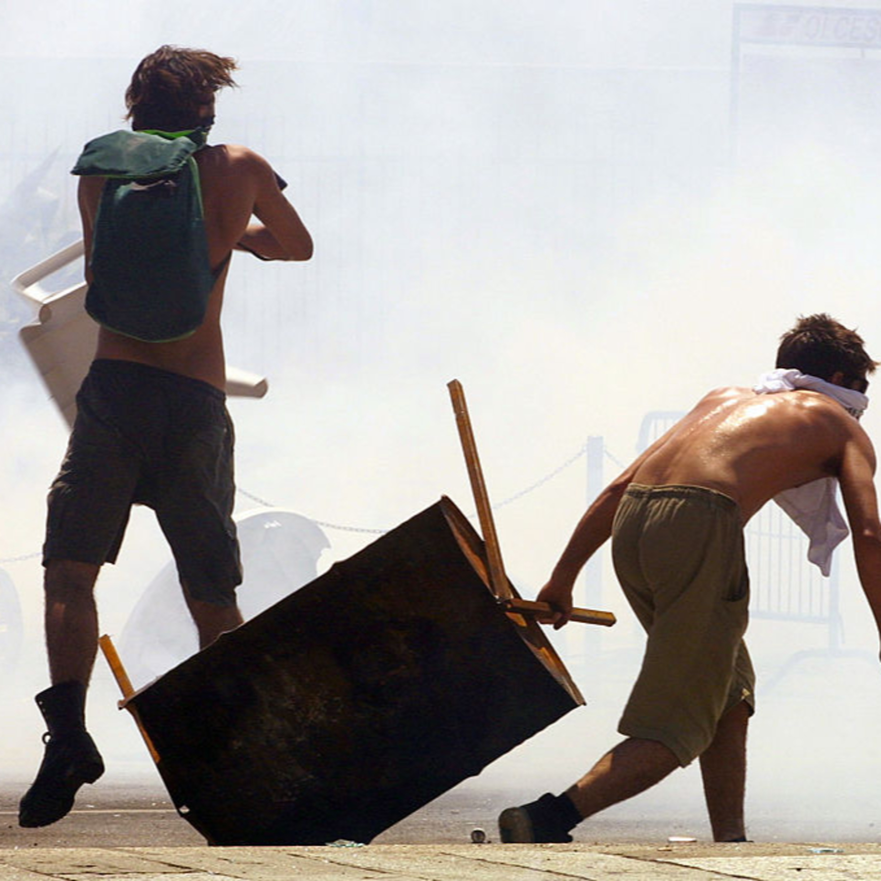 The image in this episode is a photograph fromthe insurrection which accompanied the G8 summit in Genoa in 2001 .