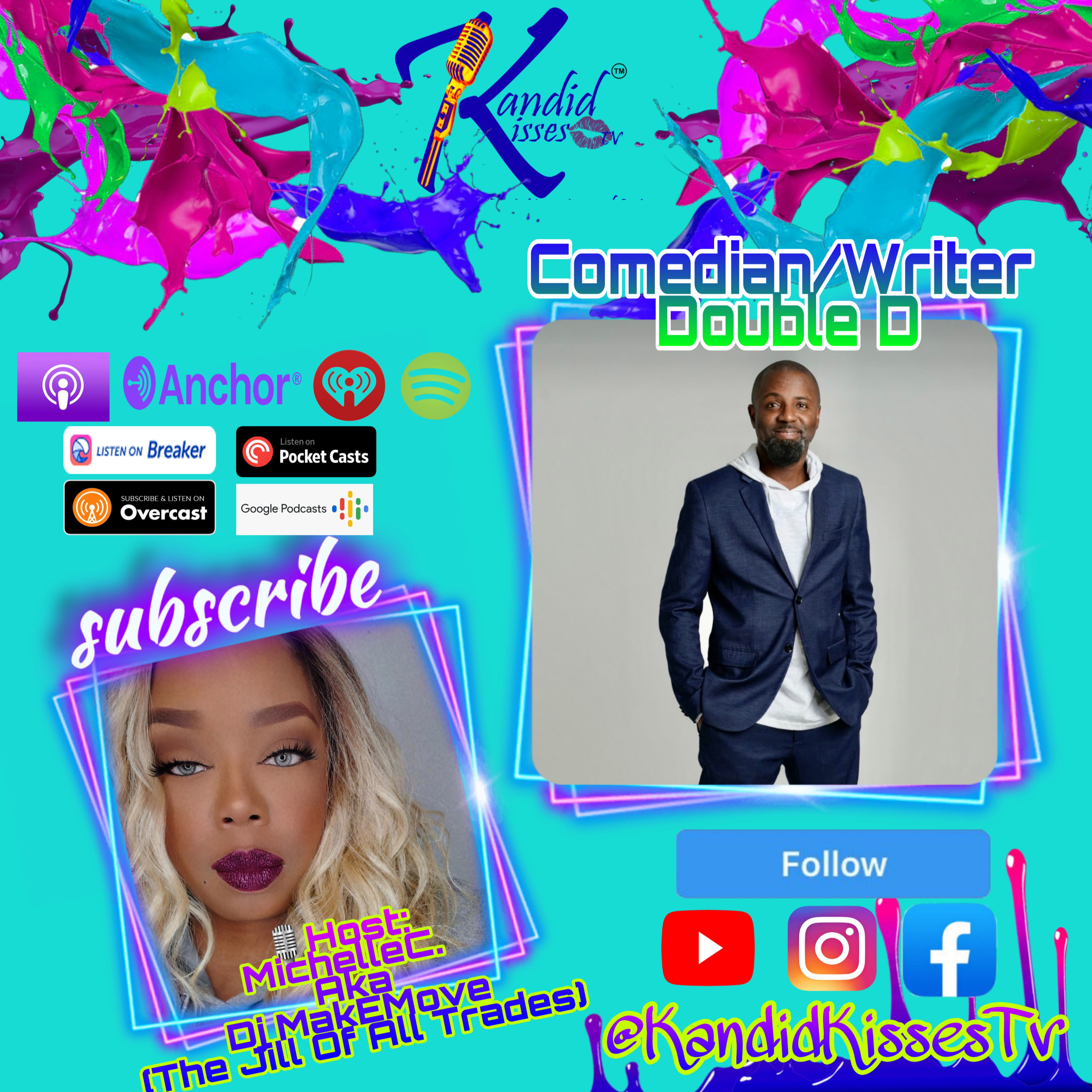 Another @Kandid Kisses Tv Episode is Locked and Loaded with the hilarious Comedian/Writer Double D! We chat about the comedy game, the entertainment industry, Versuz, Celebrity Crushes, D.A.Q's=Dumb Ass Questions, G.M.G=Grinds My Gangsta, Opera That Thing Out, and even play a round of @SingADoo ! You don't want to miss this episode! Tell a friend to tell a friend to tune in! Like, Comment, Subscribe, and Share!!!! . ,