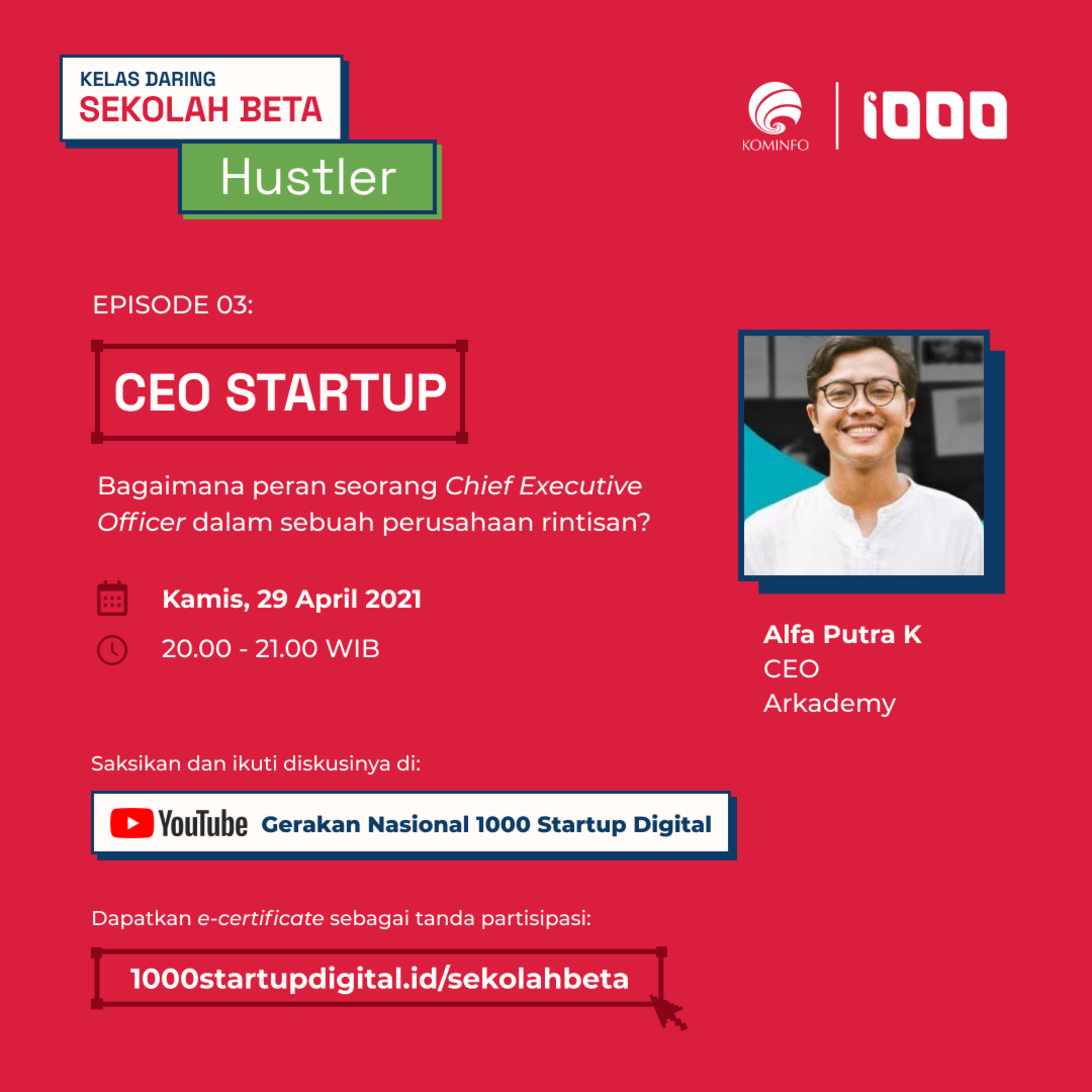 Sekolah Beta edisi Hustler menghadirkan Alfa Putra K (CEO Arkademy) yang akan berbagi pengalaman bagaimana peran seorang Chief Executive Officer dalam sebuah perusahaan rintisan?